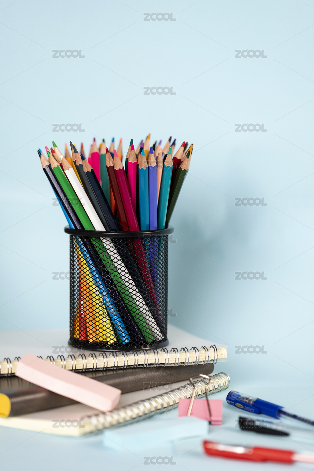 拍成上升曲线的彩色铅笔和白色的纸张背景