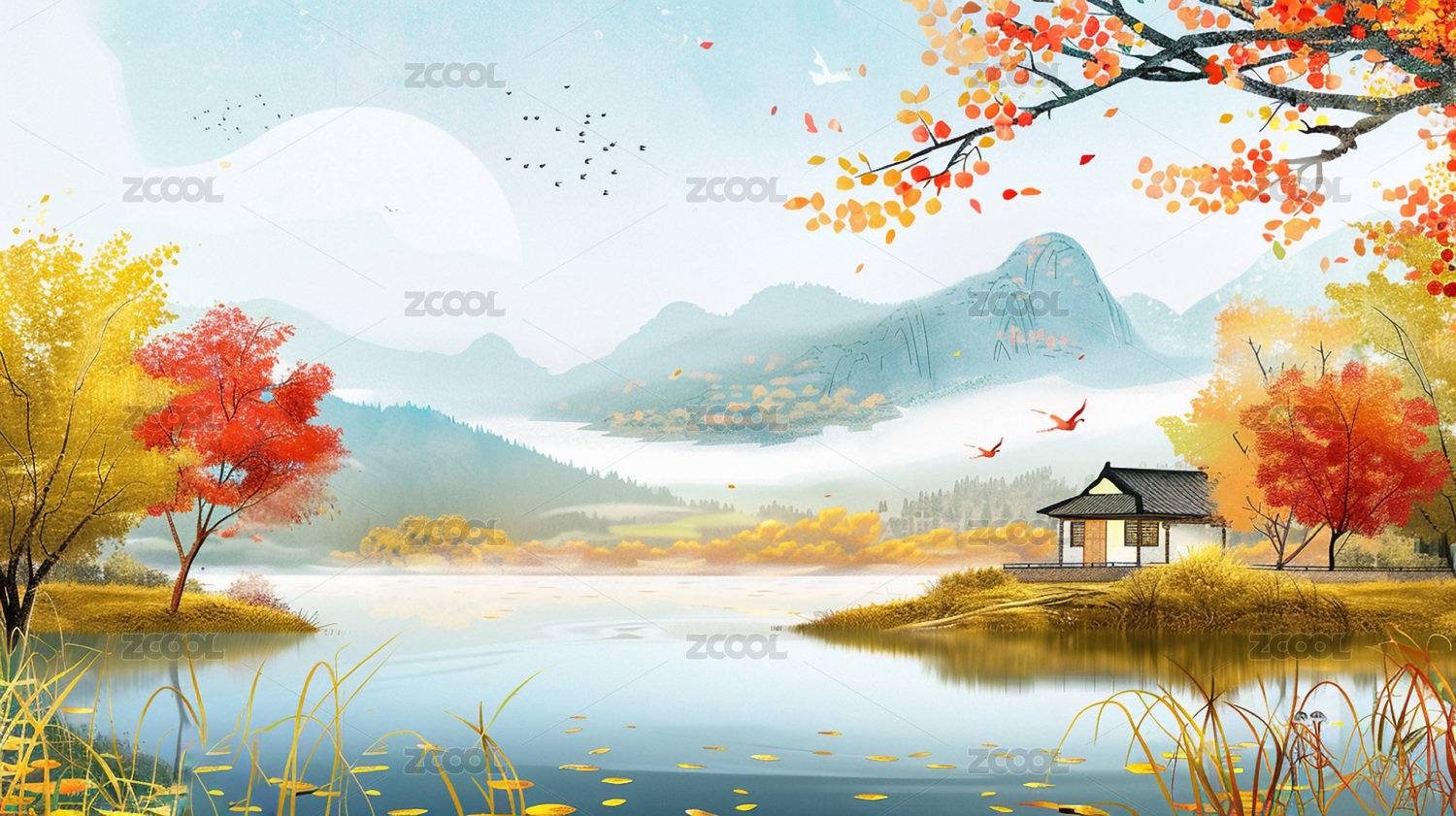 中国,水墨画,金黄色,江南,乡村,秋天,多彩,水墨,水彩,山水