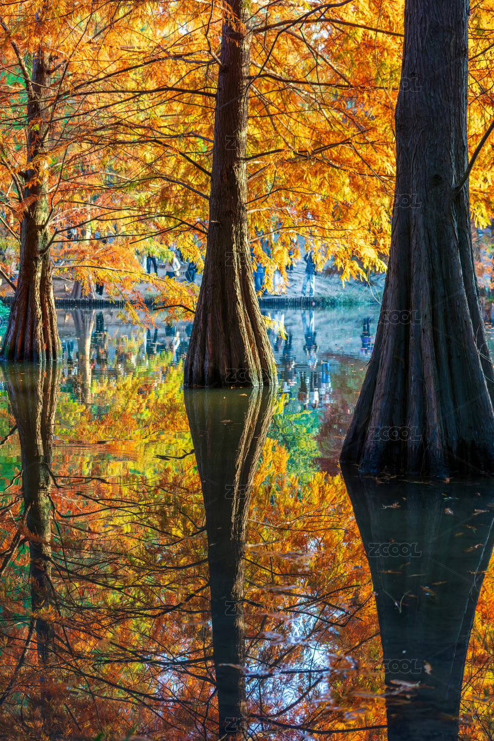 秋天湖里的水杉树斑斓的叶子与倒影