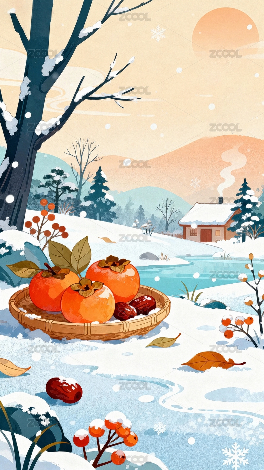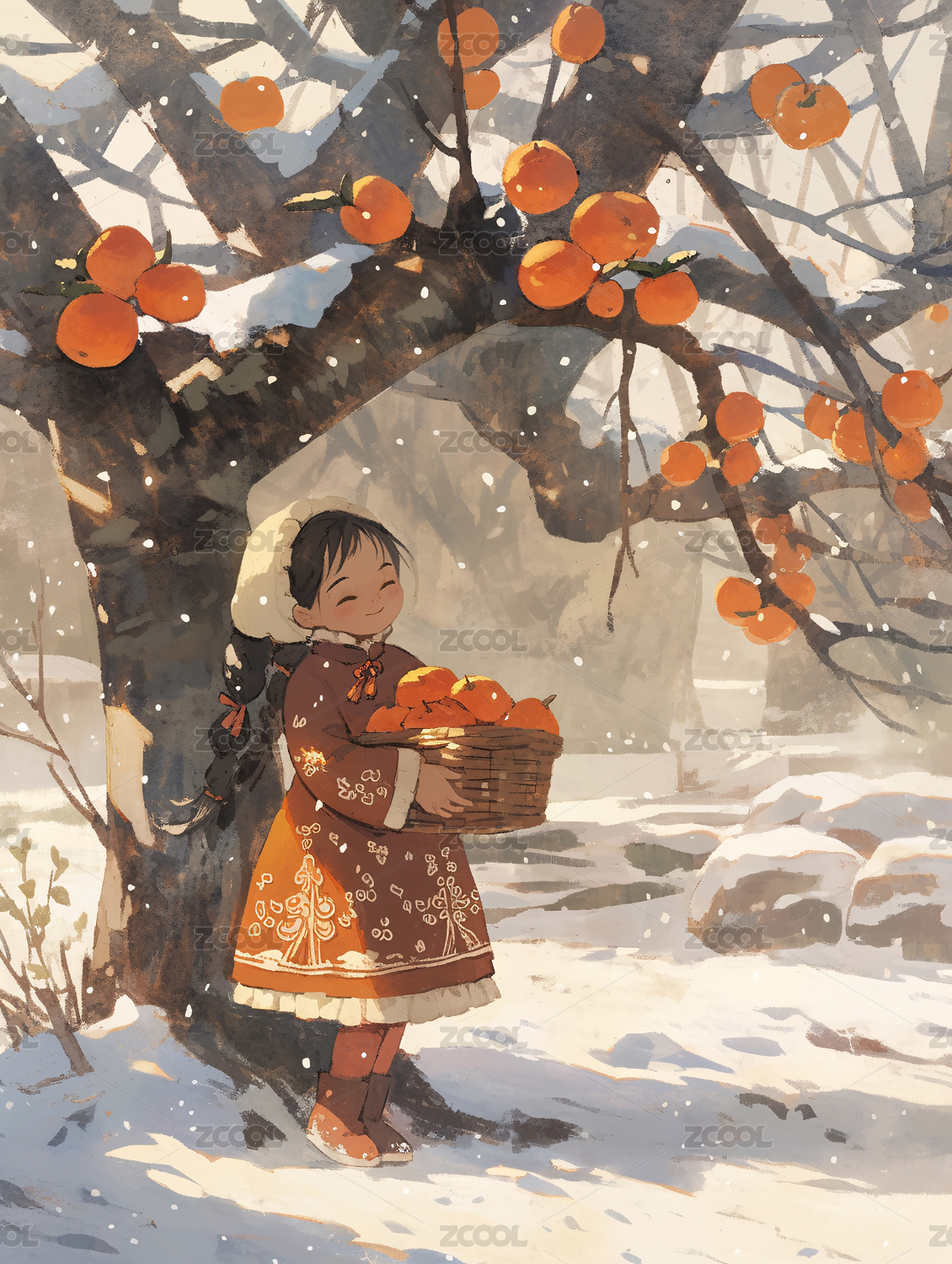 小雪节气插画冬天女孩和狗卖桔子治愈系插画