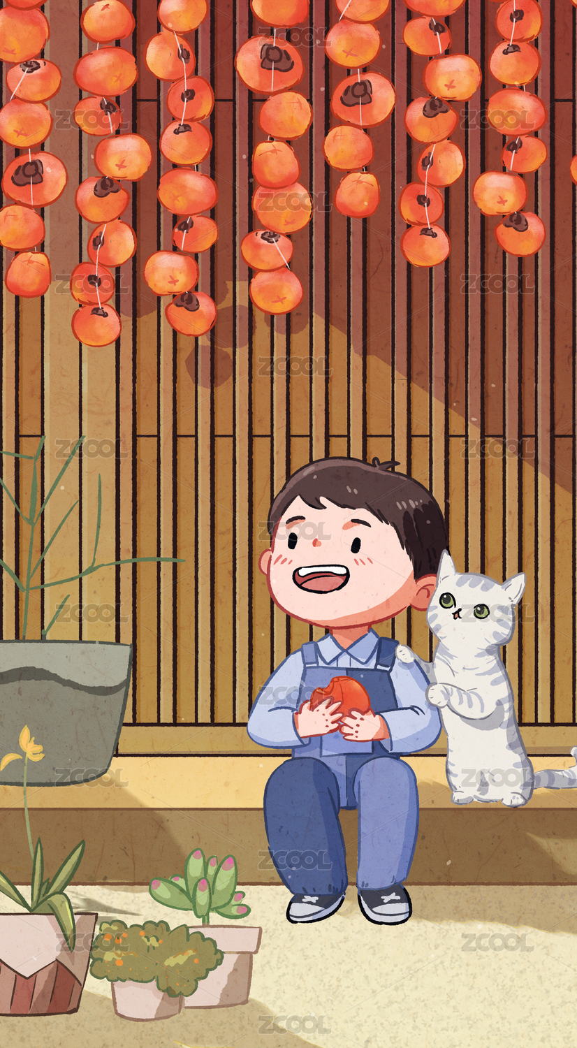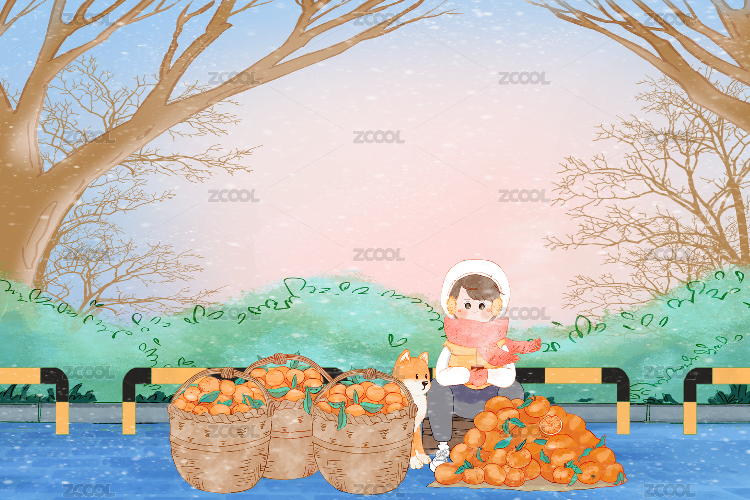 冬天桔子黄了女孩狗卖桔子小雪节气治愈插画
