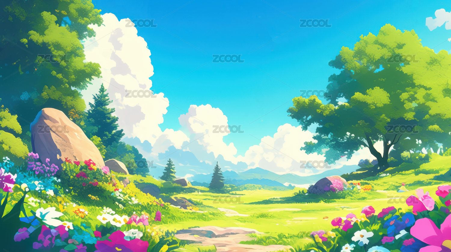 3D卡通春天草地可爱粉色花朵三维自然背景