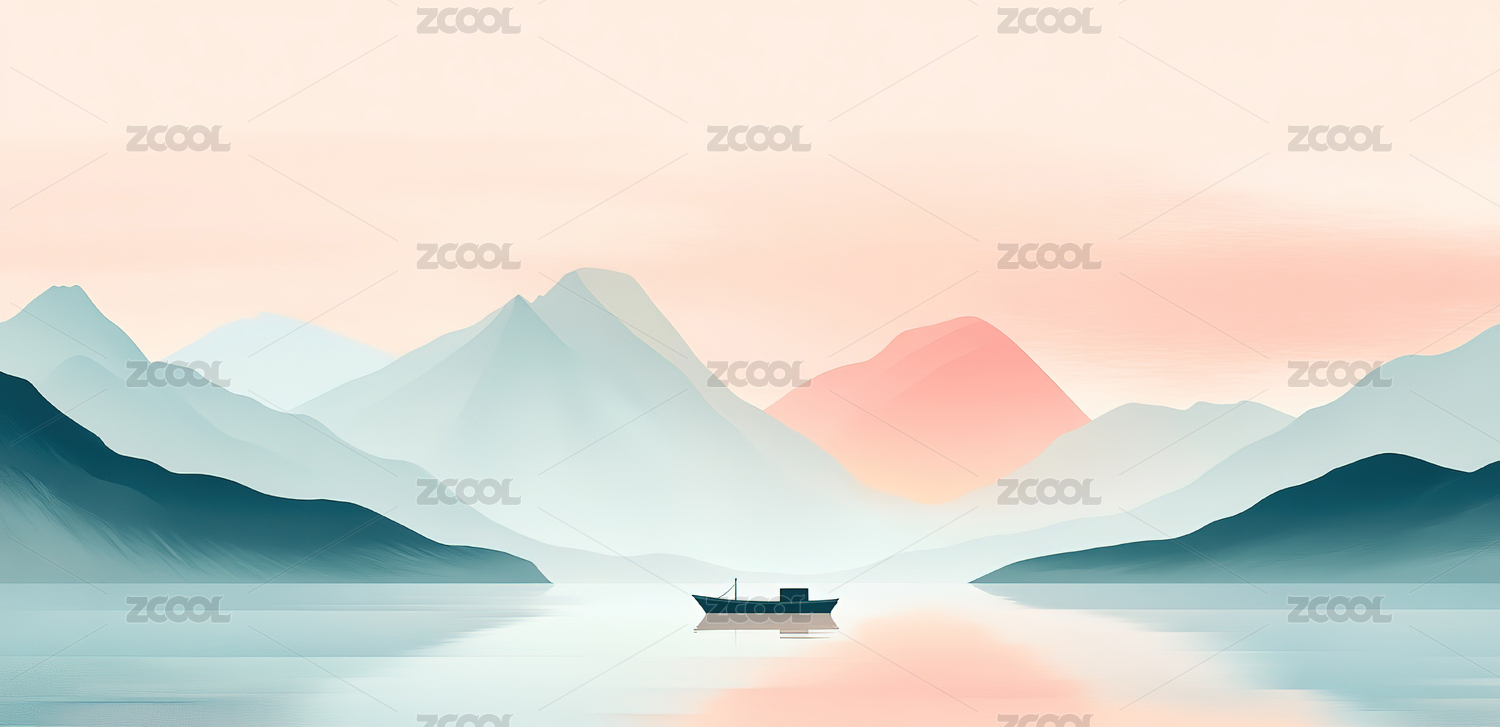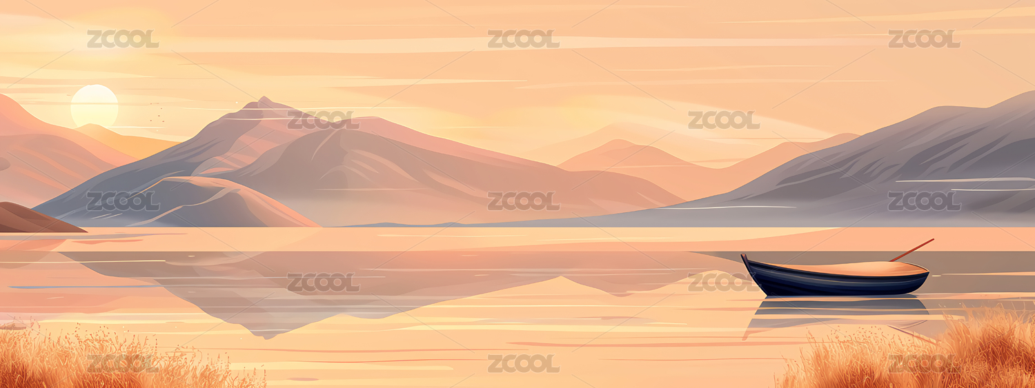 湖边,景色,风景,山峰,天空,云彩,小船,芦苇,植物,太阳