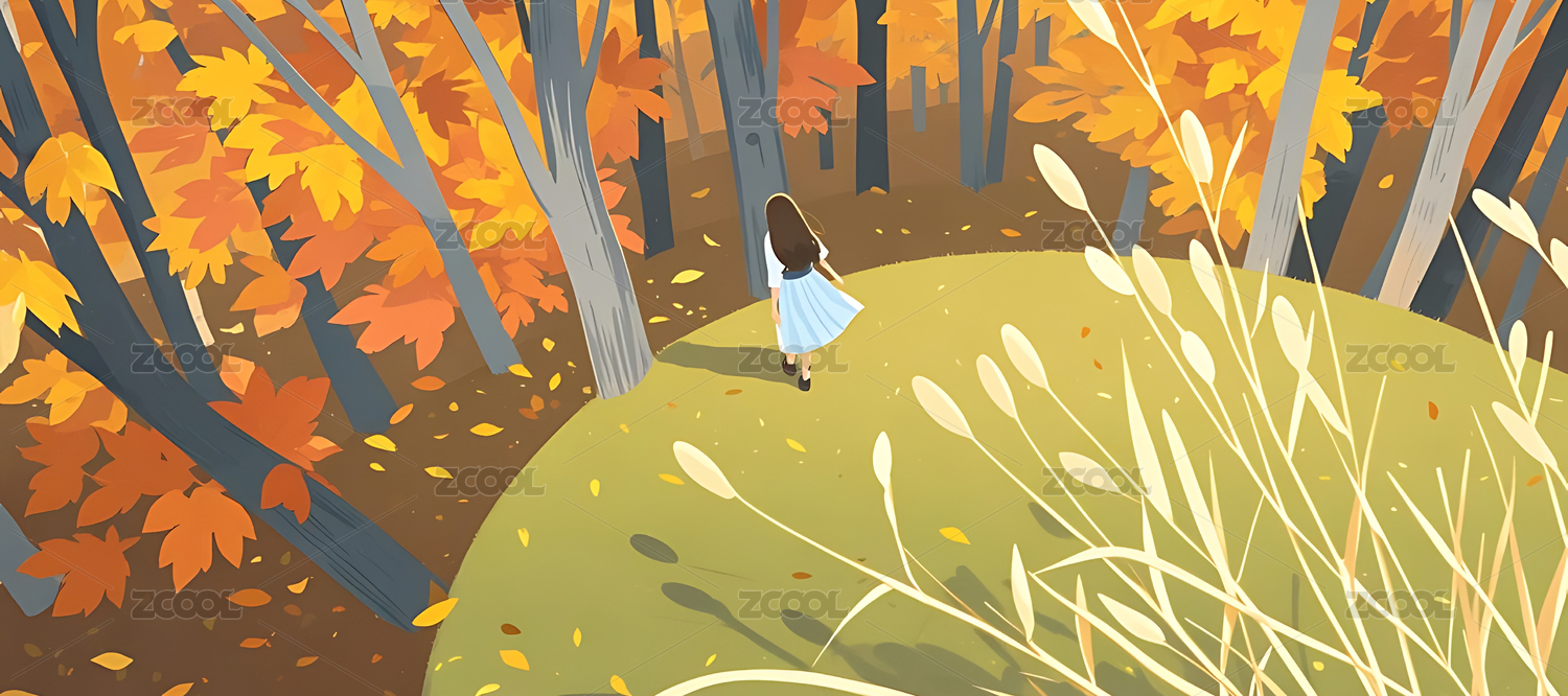 秋天,人物,插画,背景,背影,女孩,蓝天,白云,地形,草地