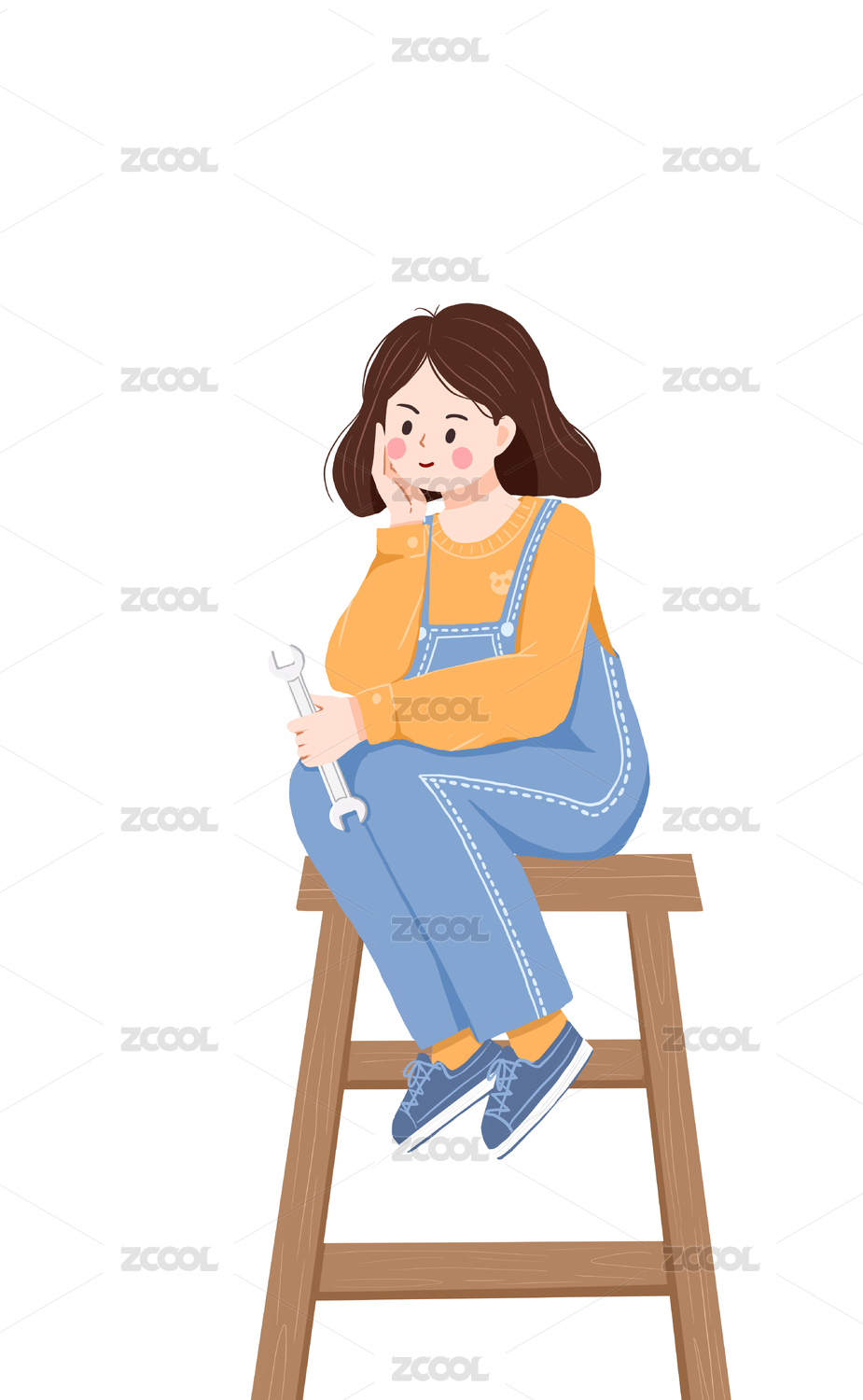 穿背带裤的短发少女坐在梯子上思考 插画