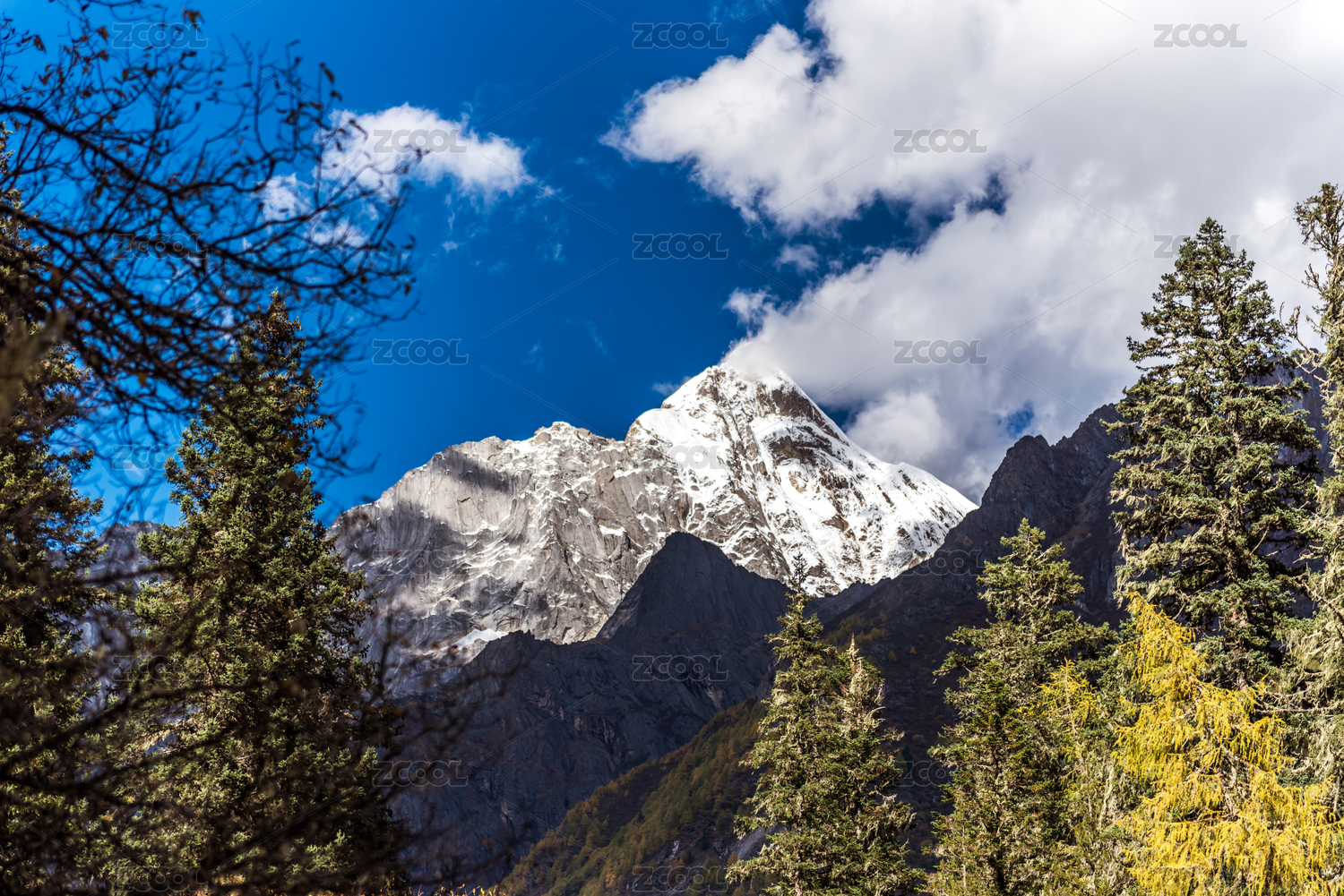 云南德钦白马雪山蓝天白云衬托雪山森林