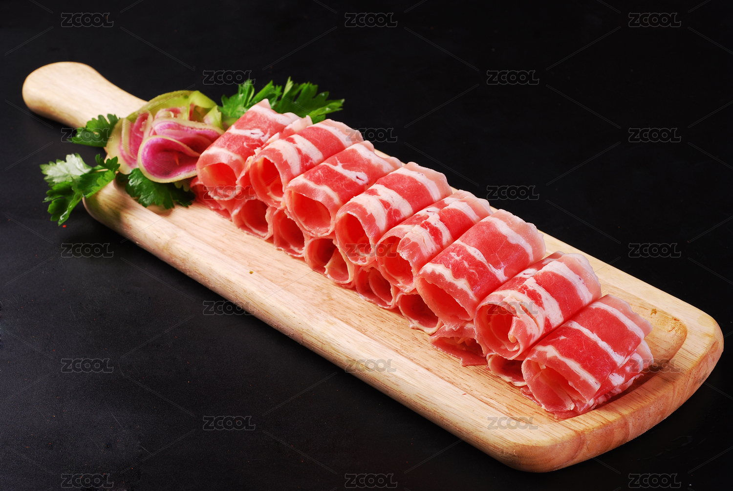 深色桌上盘里的重庆老火锅菜品牛肉片羊肉片