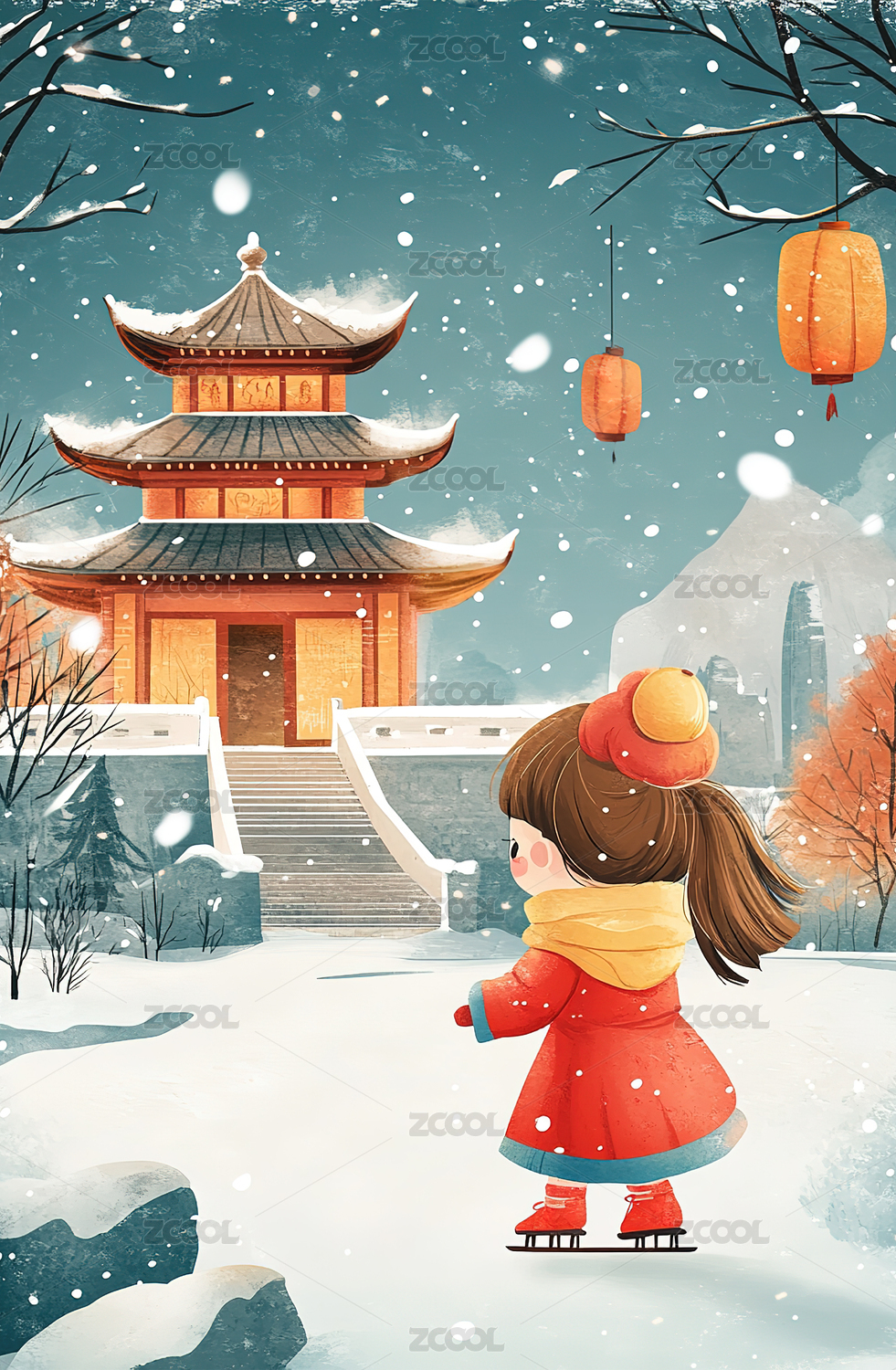 冬天,冬季,女孩,插画,阳光,故宫,红色,温暖,梅花,小雪