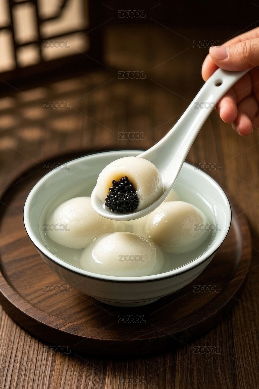 桌上一碗汤圆,勺子里有一颗破口流出馅料的