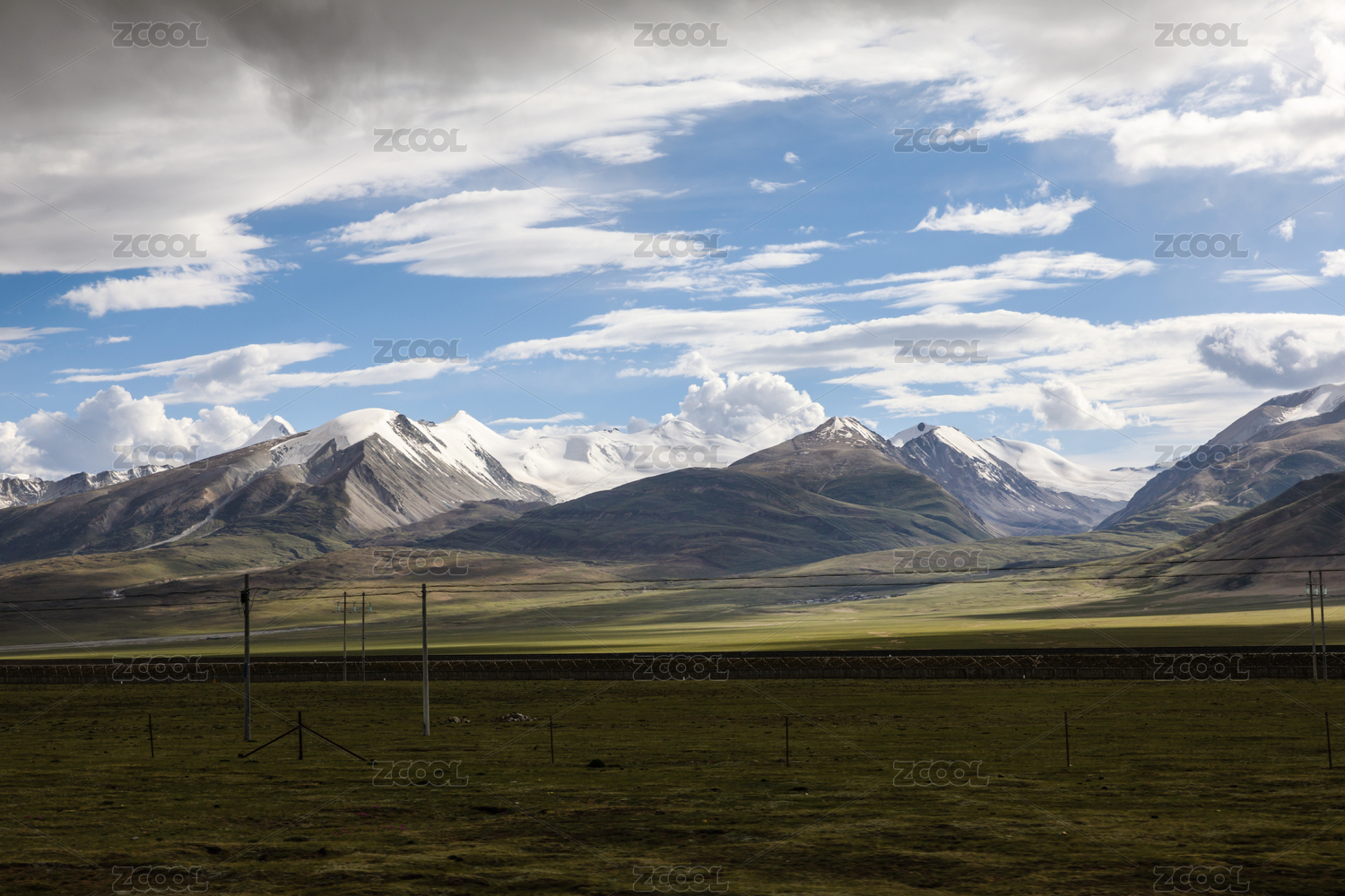 蓝天白云下的草原山脉和高原牧场,中国西藏