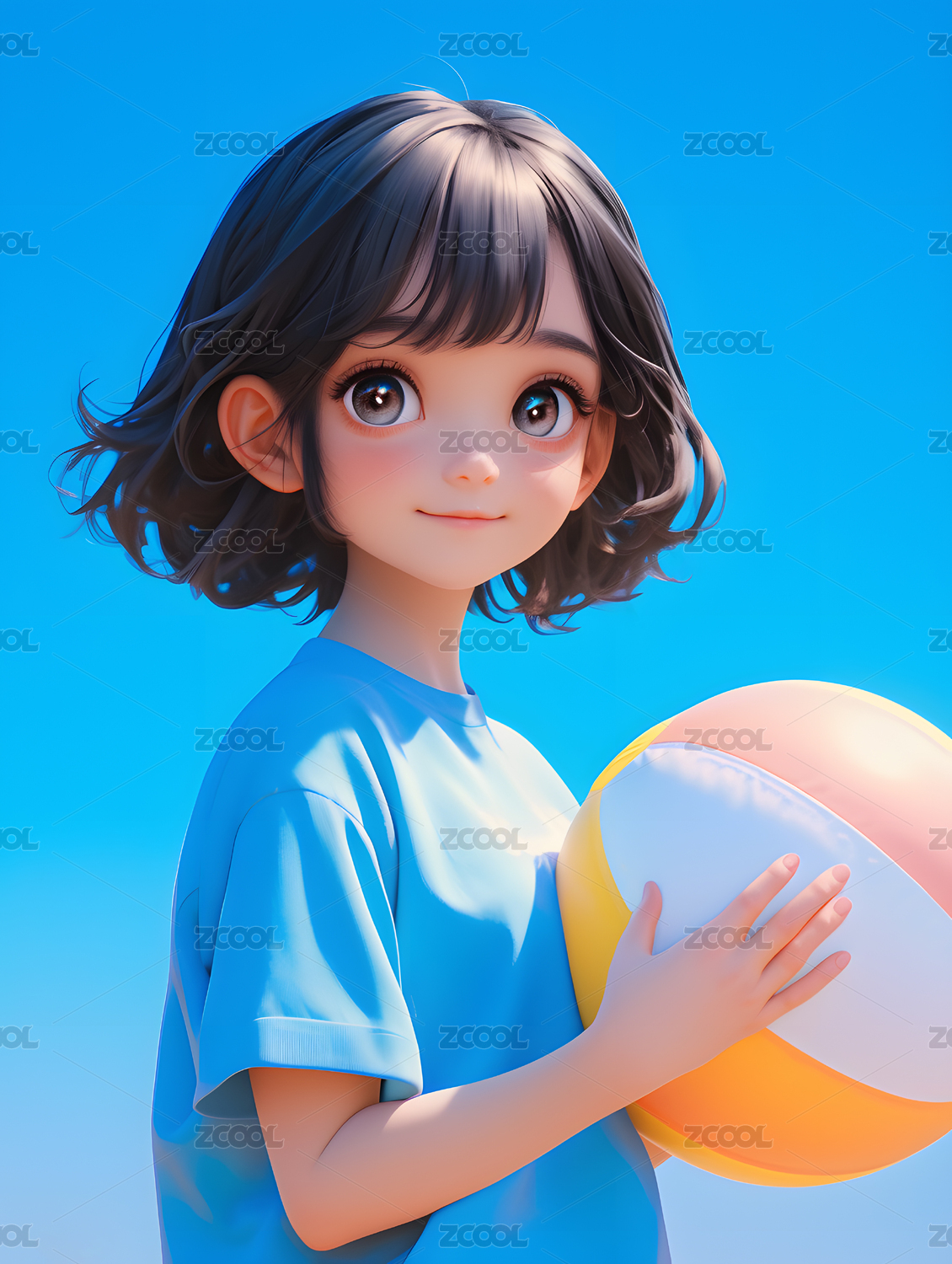 AIGC202401,女孩,微笑,运动,体育,3D,可爱,卡通,足球,天空