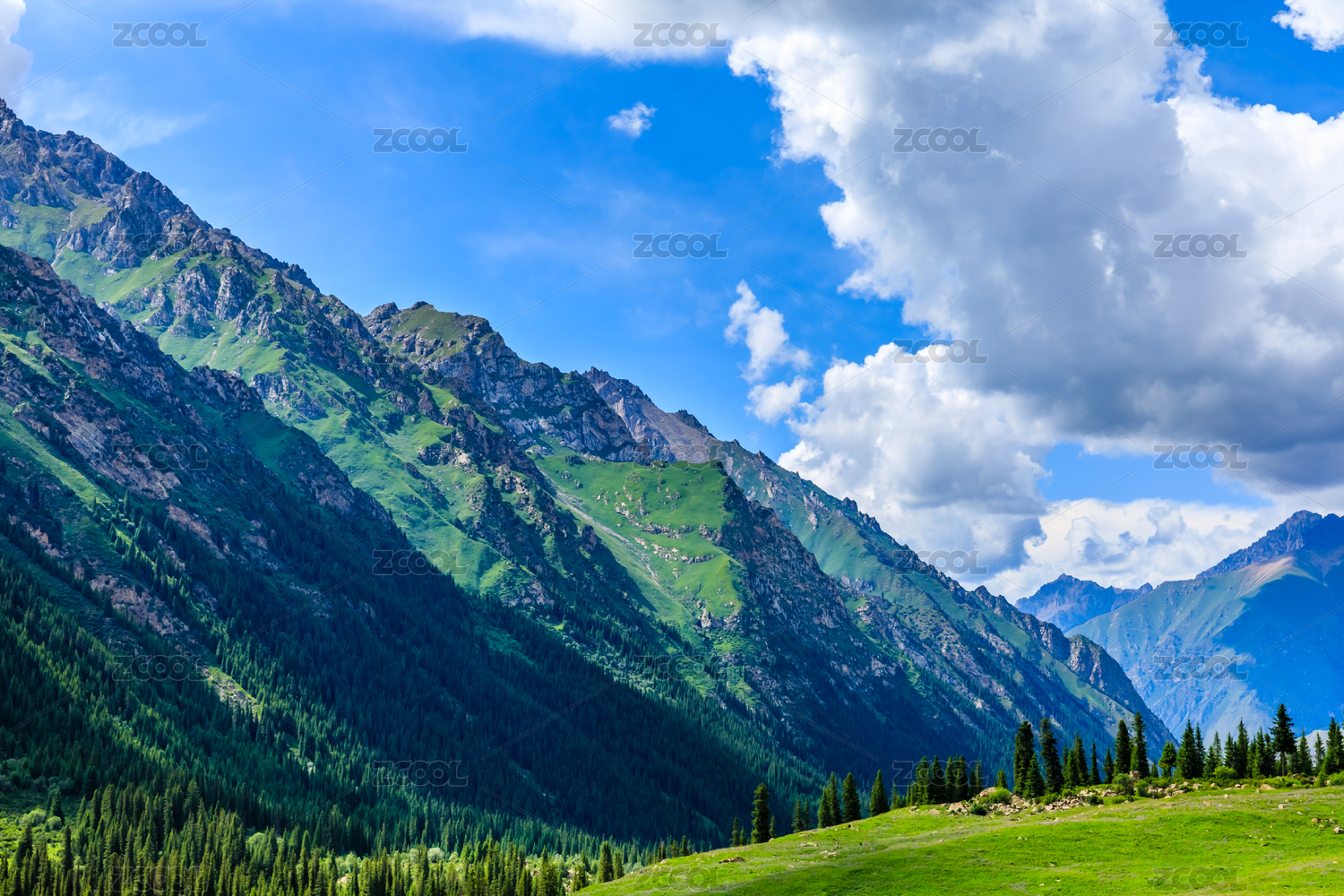 新疆下塔风景区雄伟的山脉和绿色的草原风光