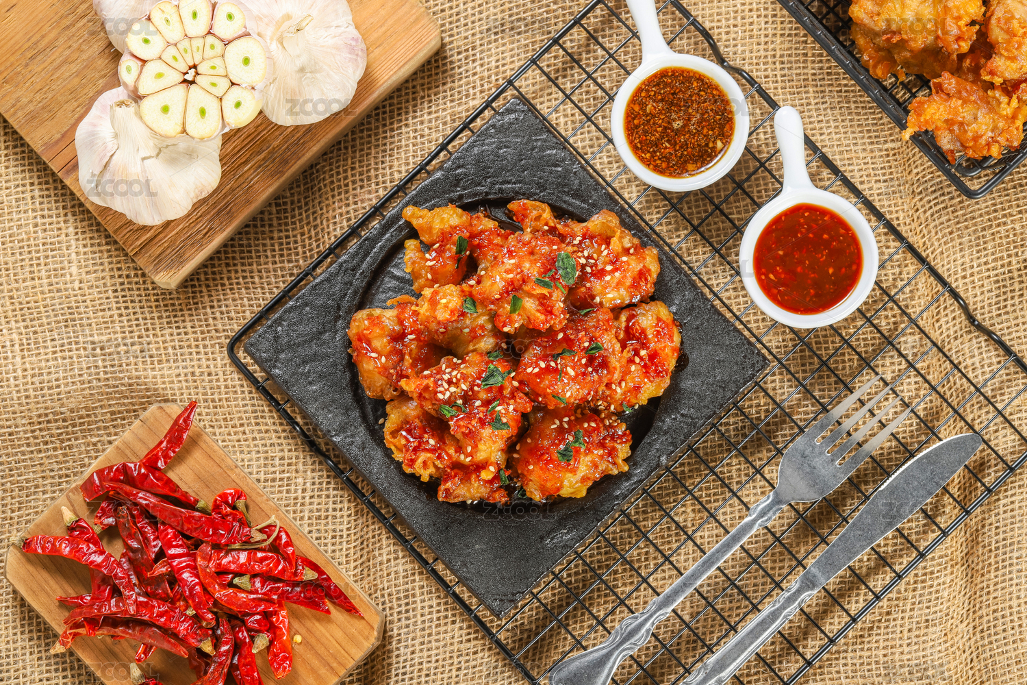 韩式炸鸡,炸鸡,韩式料理,酱料,托盘,餐具