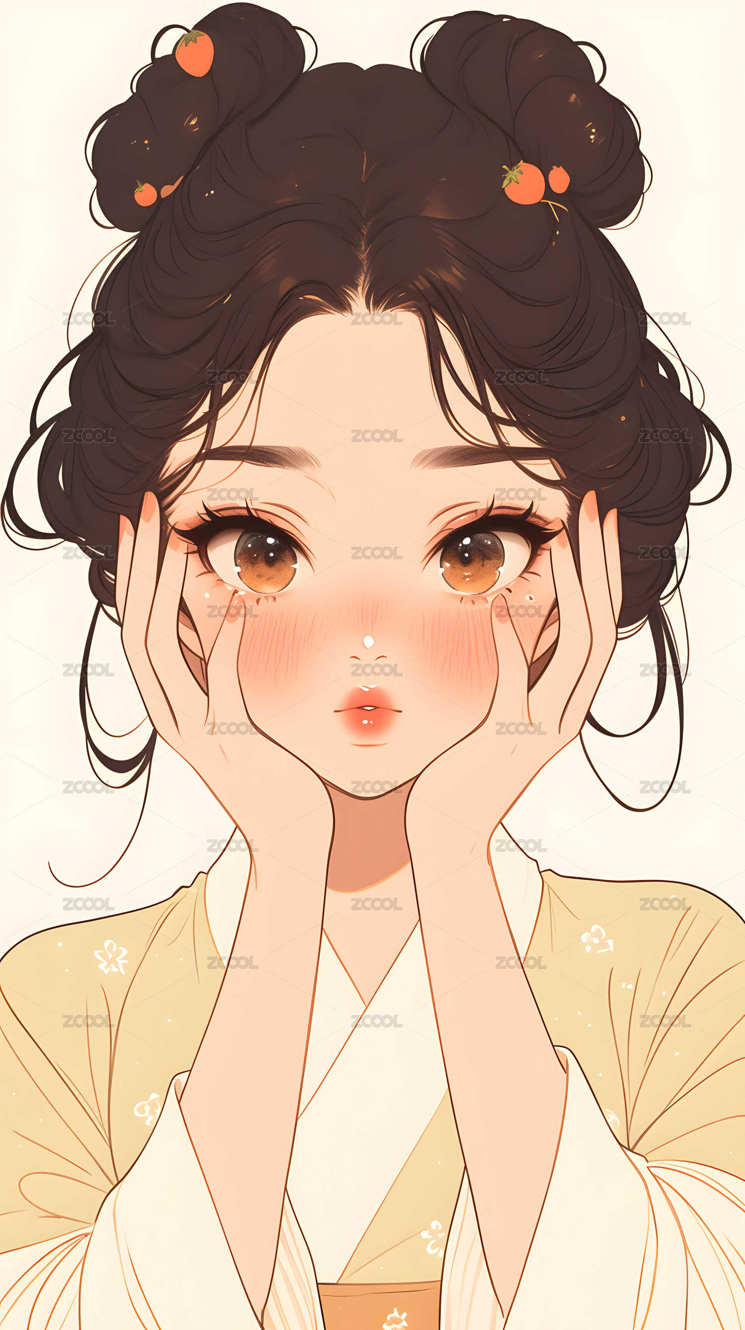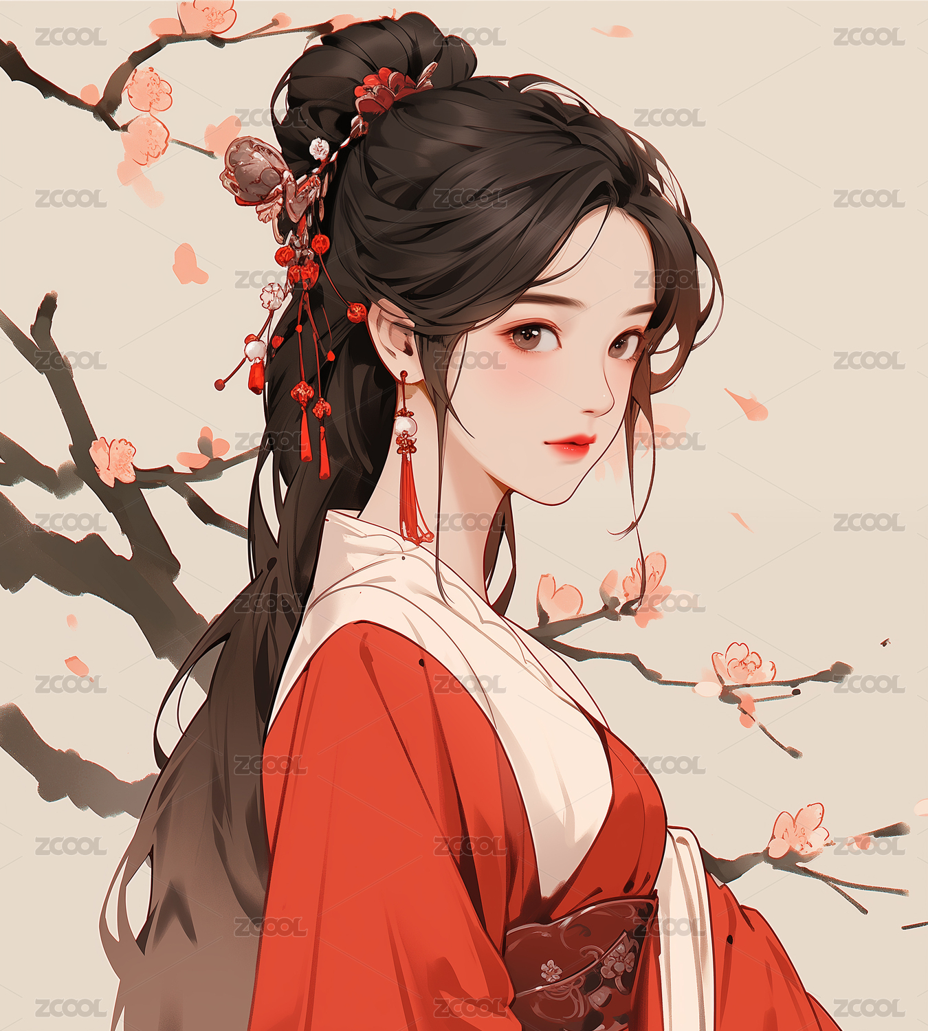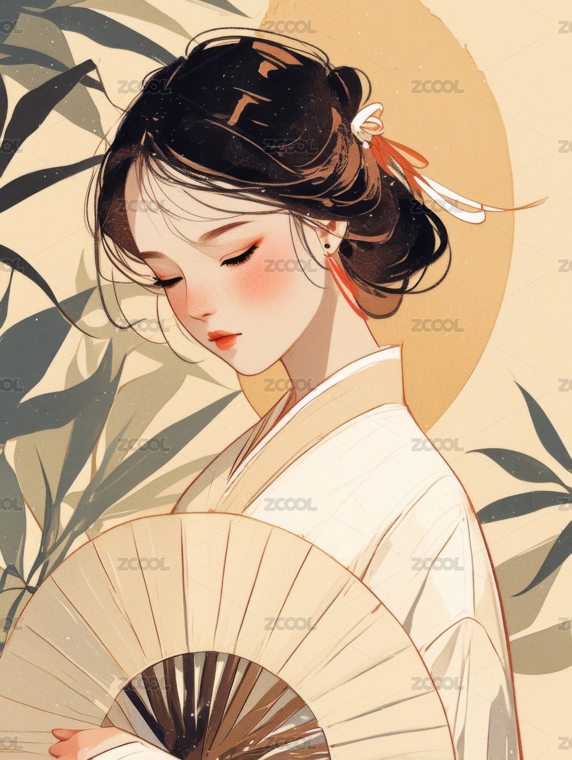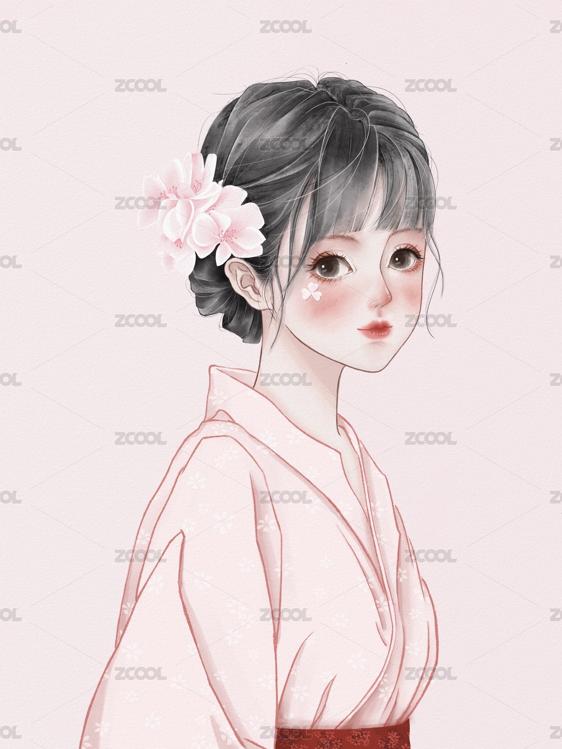 穿着和服并且头戴樱的女孩睁开眼睛注视前方