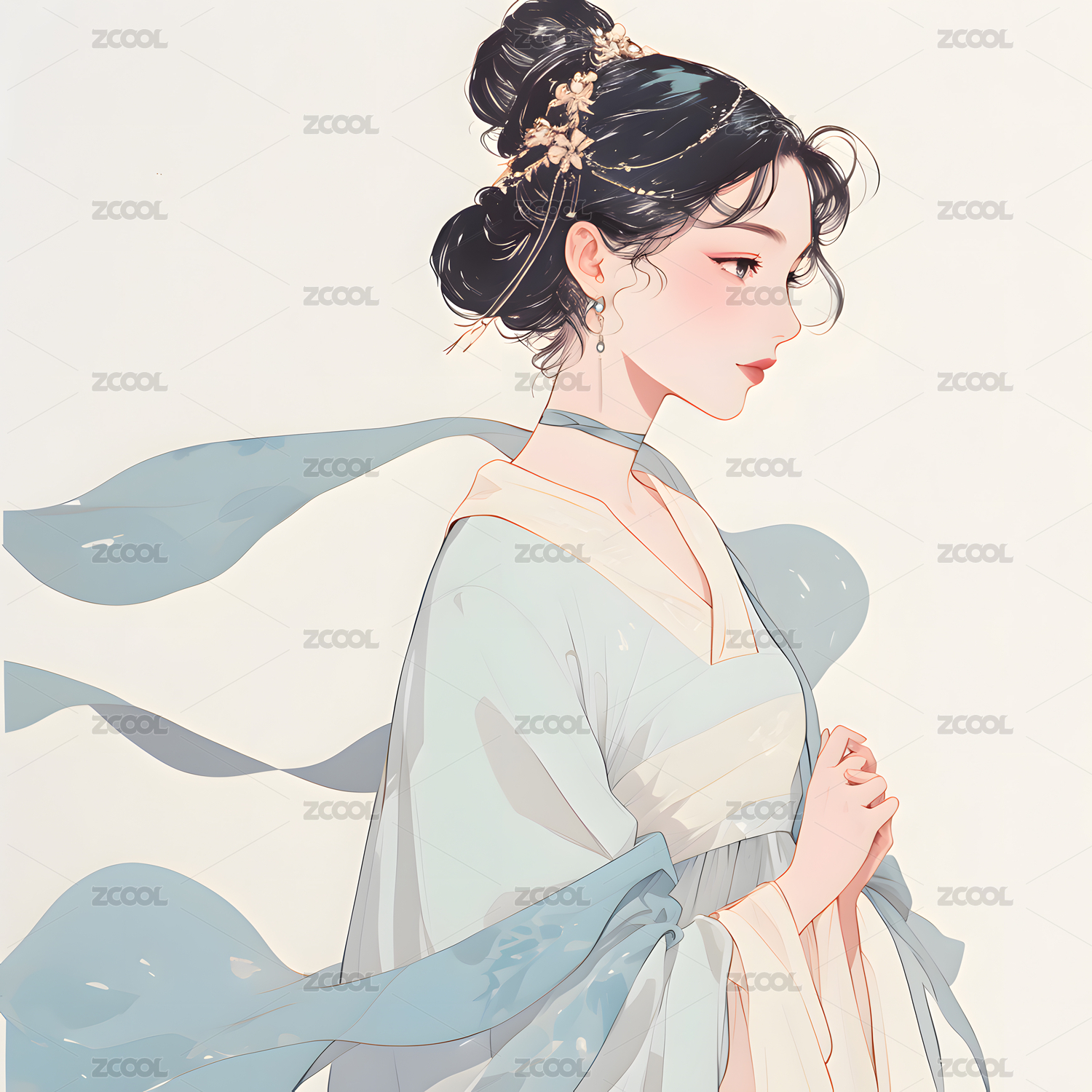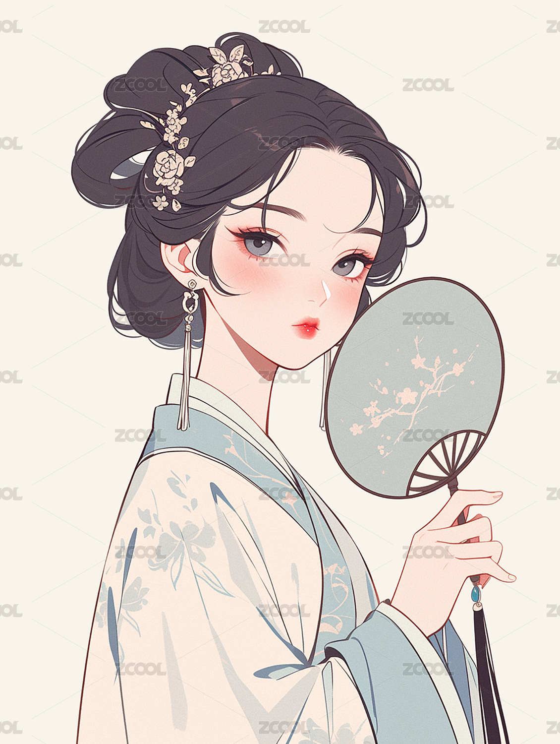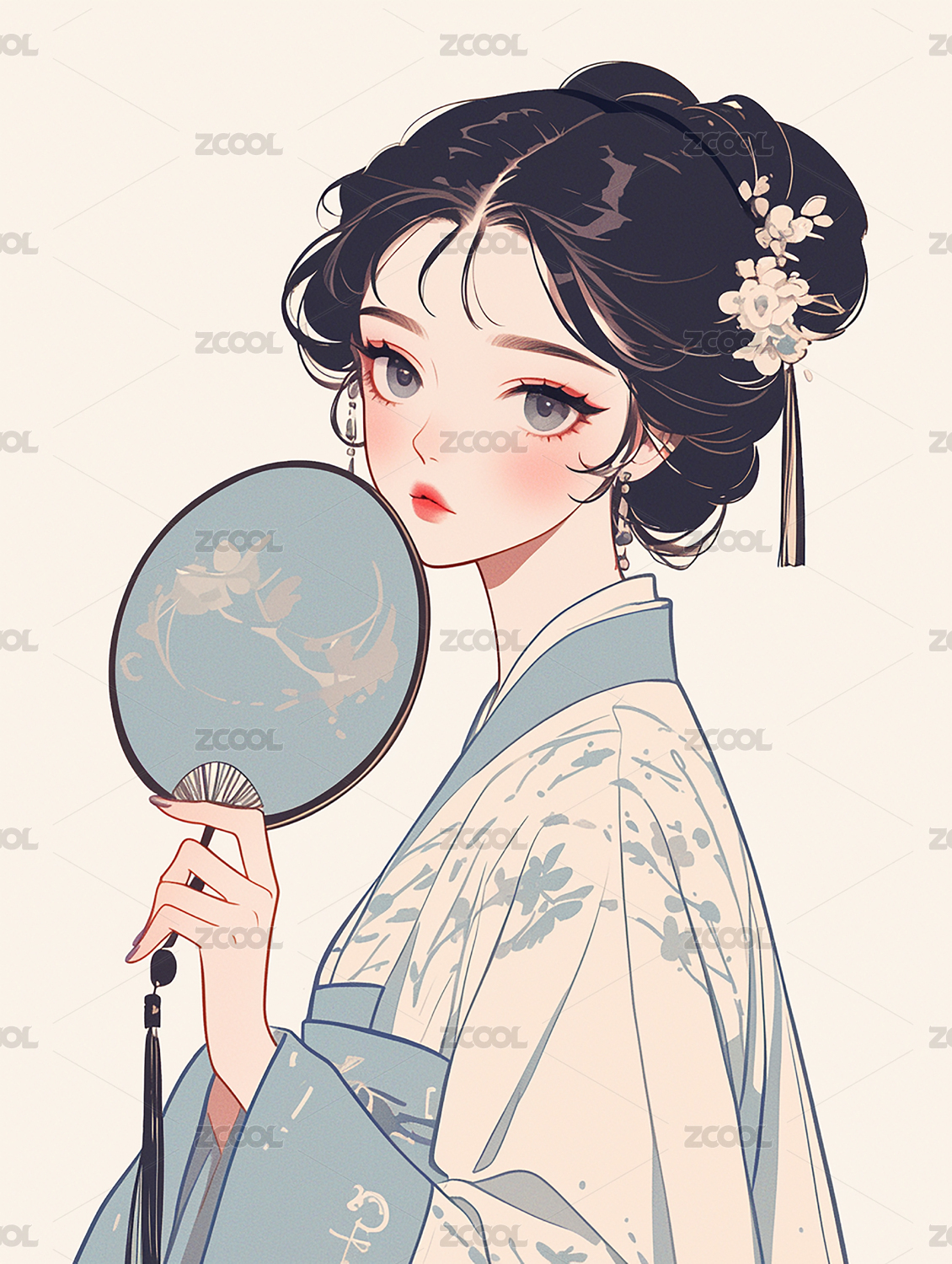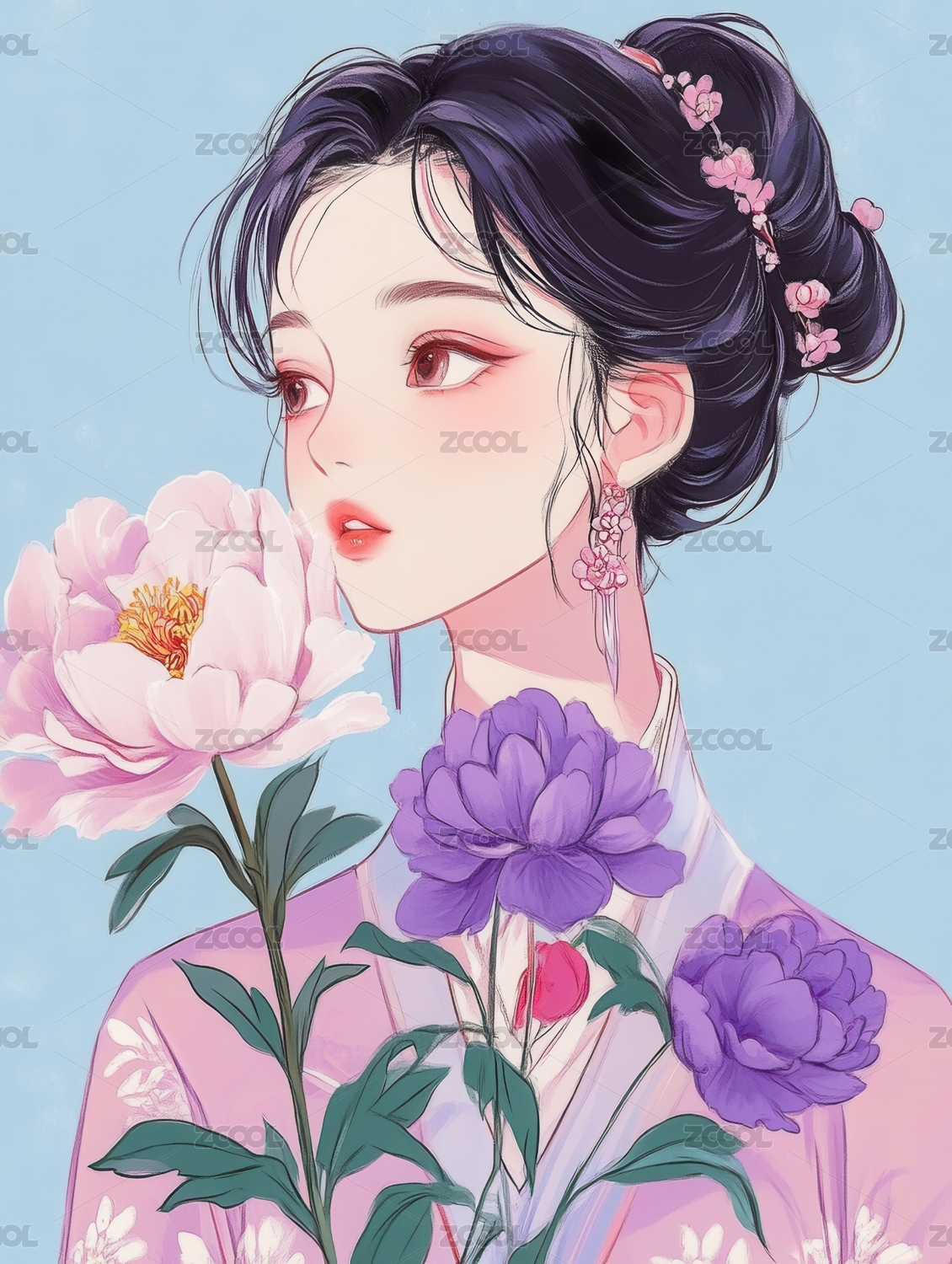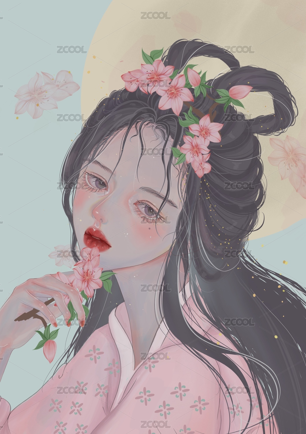 穿着和服并且头戴樱的女孩睁开眼睛注视前方