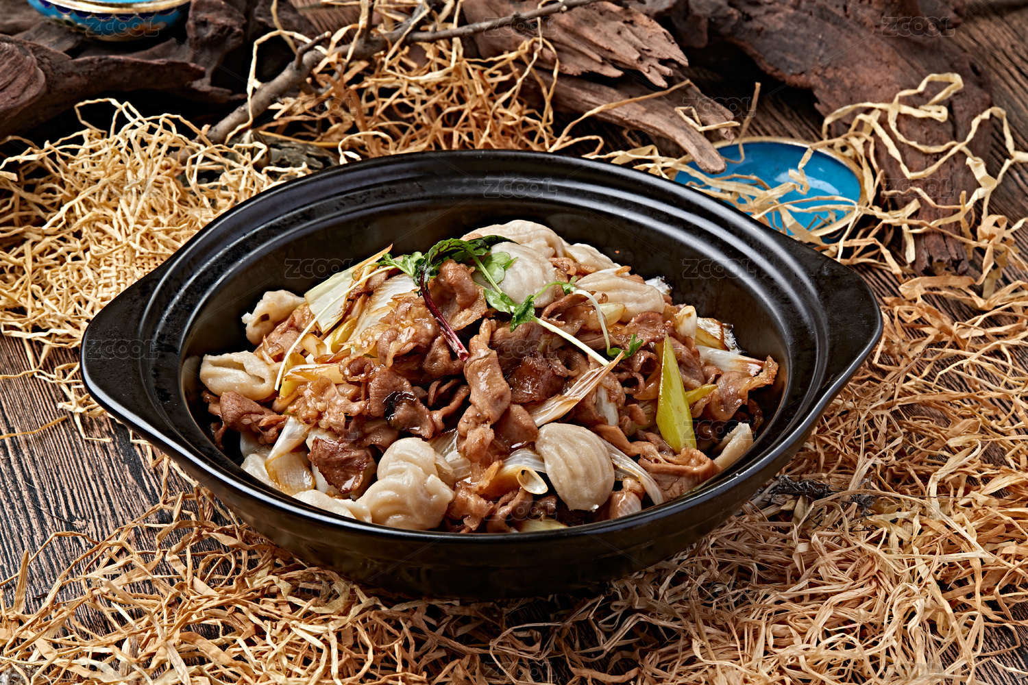 传统菜式蚂蚁上树盛放在黑色的陶瓷碗中