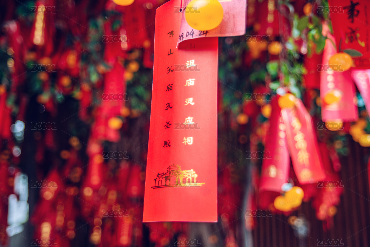 中国广东省佛山祖庙孔圣园内许愿树上挂满的红色许愿带