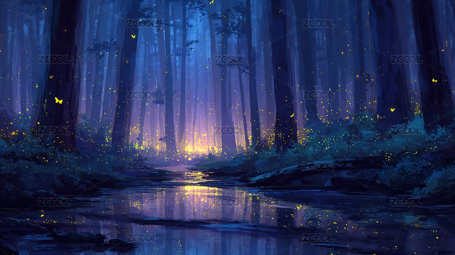 森林夜晚星空河流萤火虫神秘宁静唯美插画