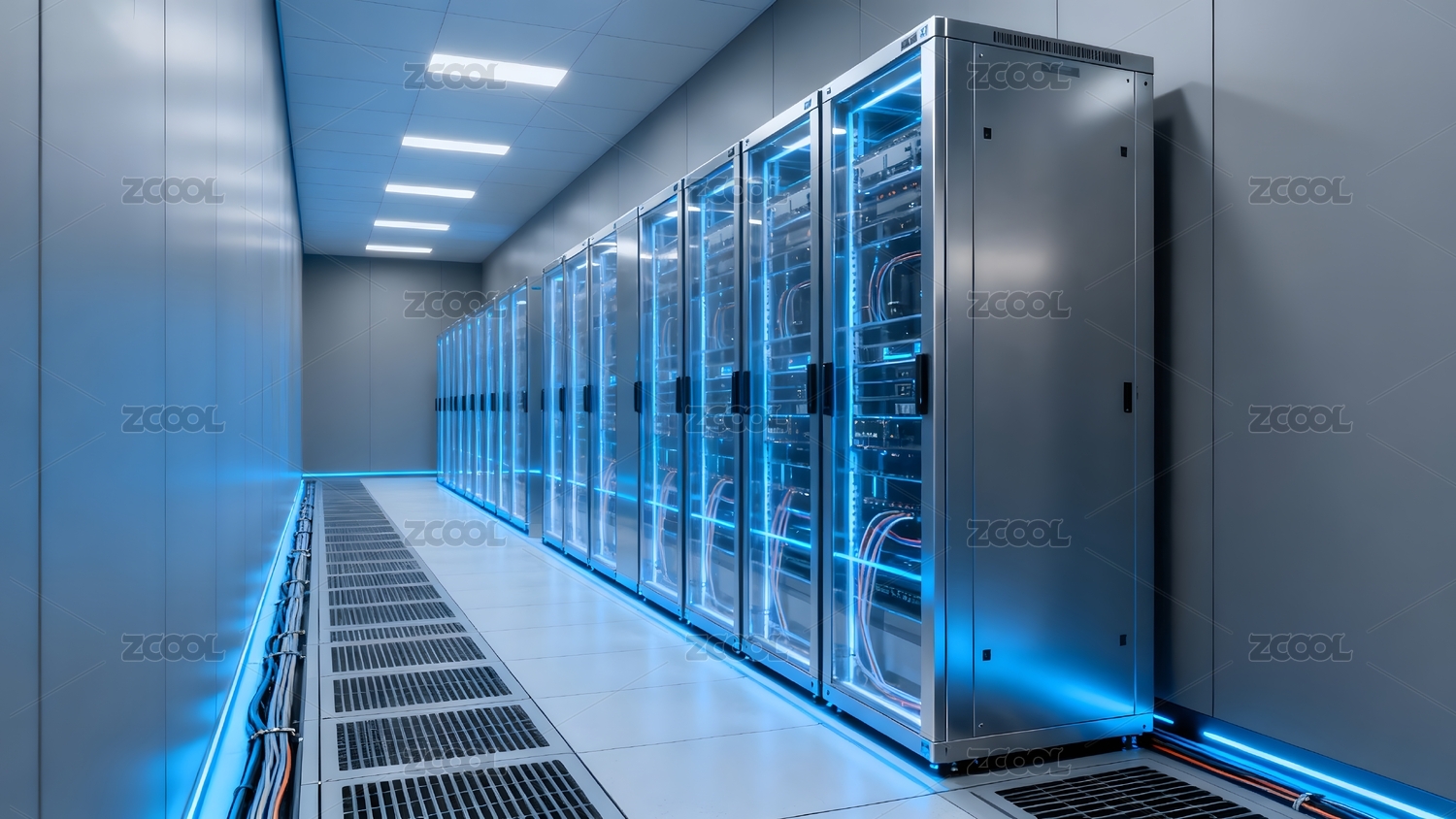 三维渲染的现代化高科技的服务器机房,强大的数据库和运算存储能力。
