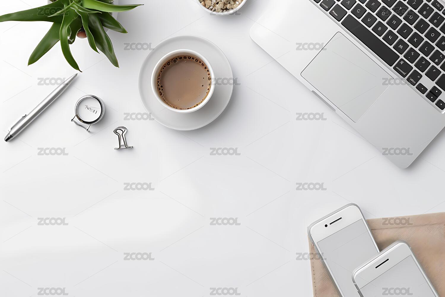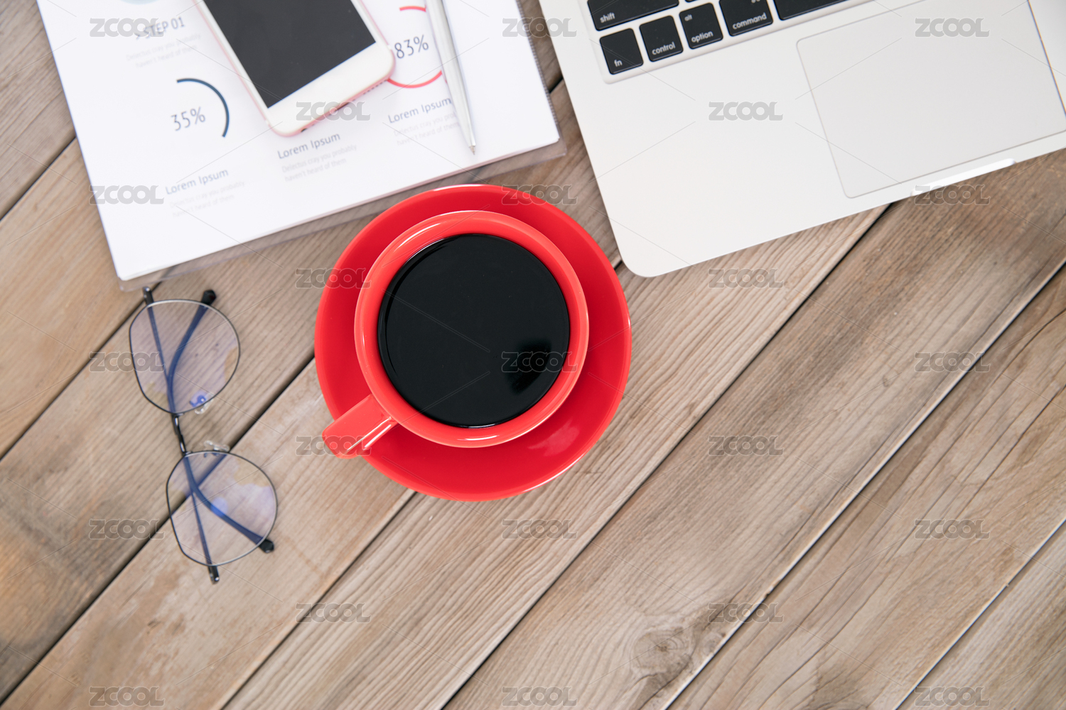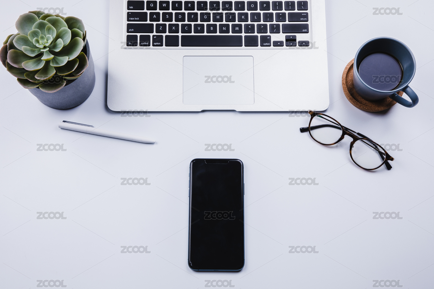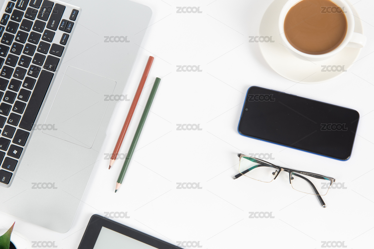 正上方视角特写书桌上放着笔记本电脑眼镜咖啡手机以及各种办公用品