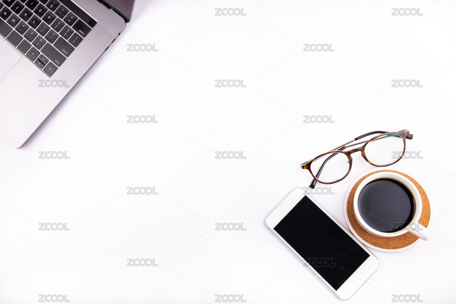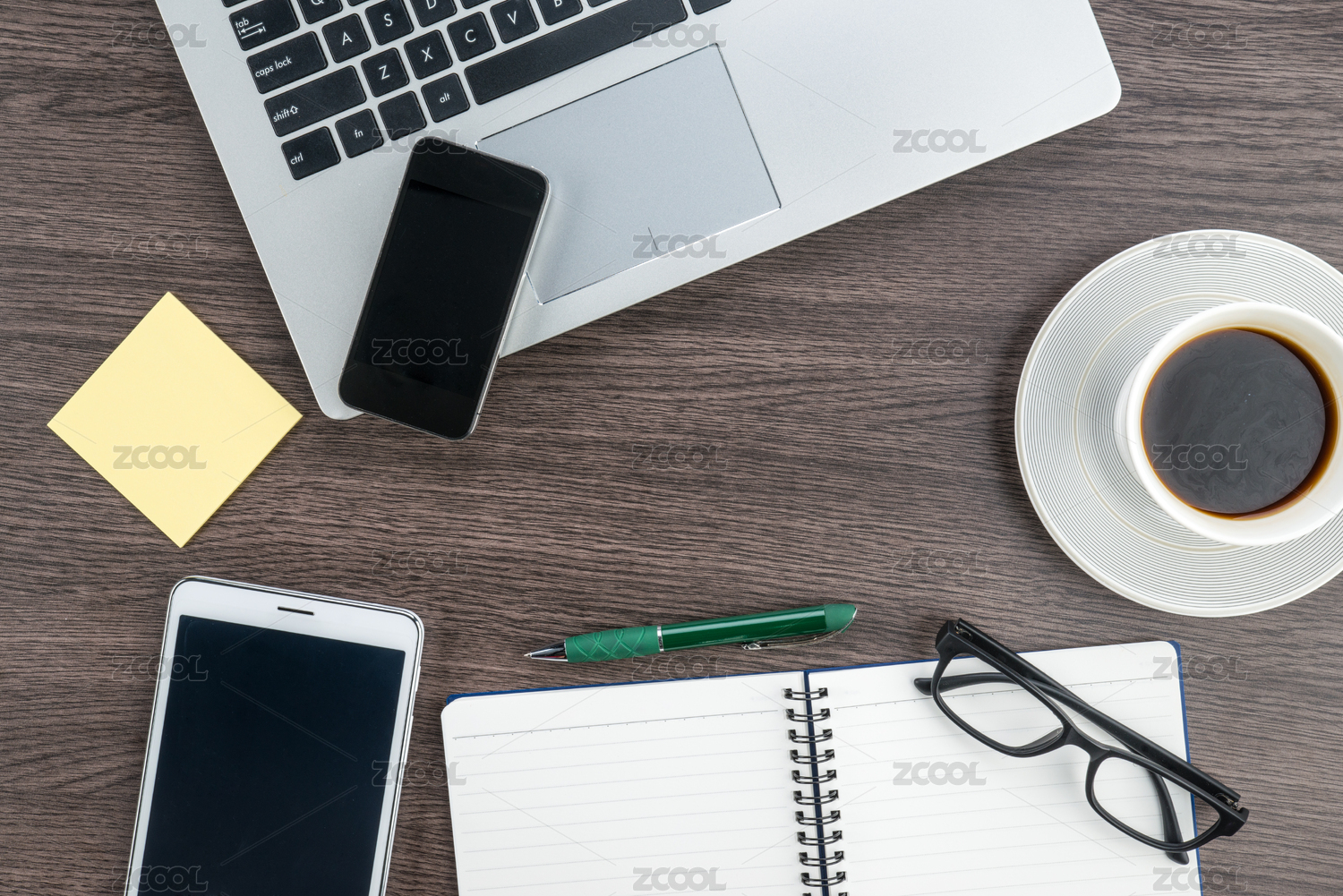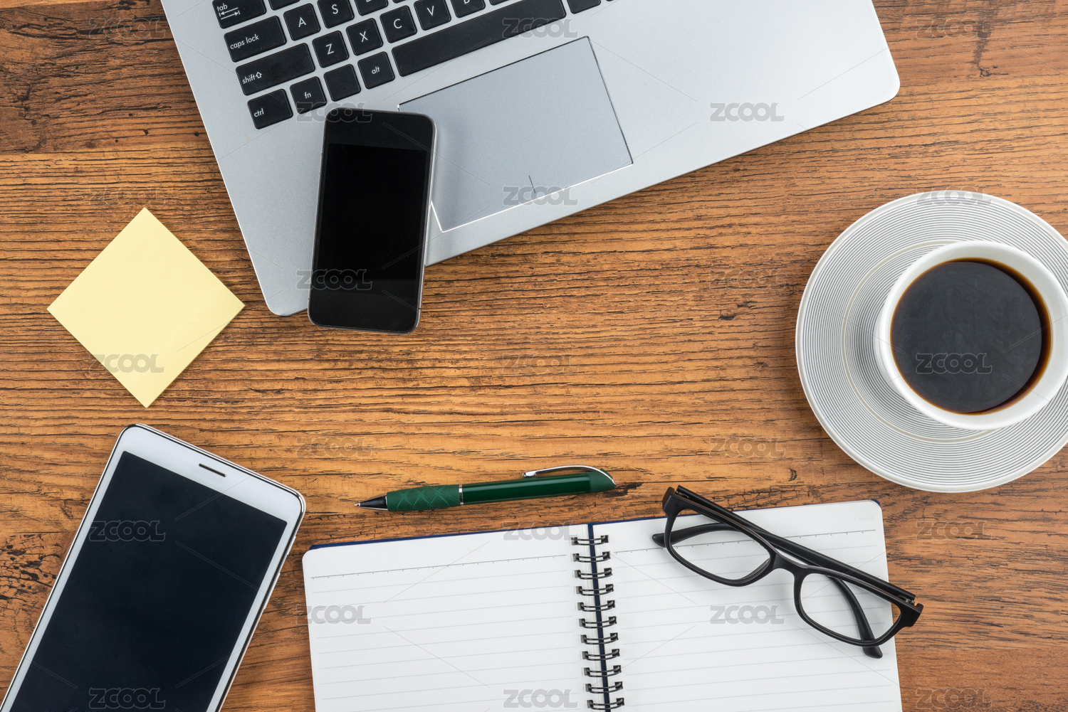 正上方视角特写书桌上放着笔记本电脑,眼镜,智能手机和咖啡