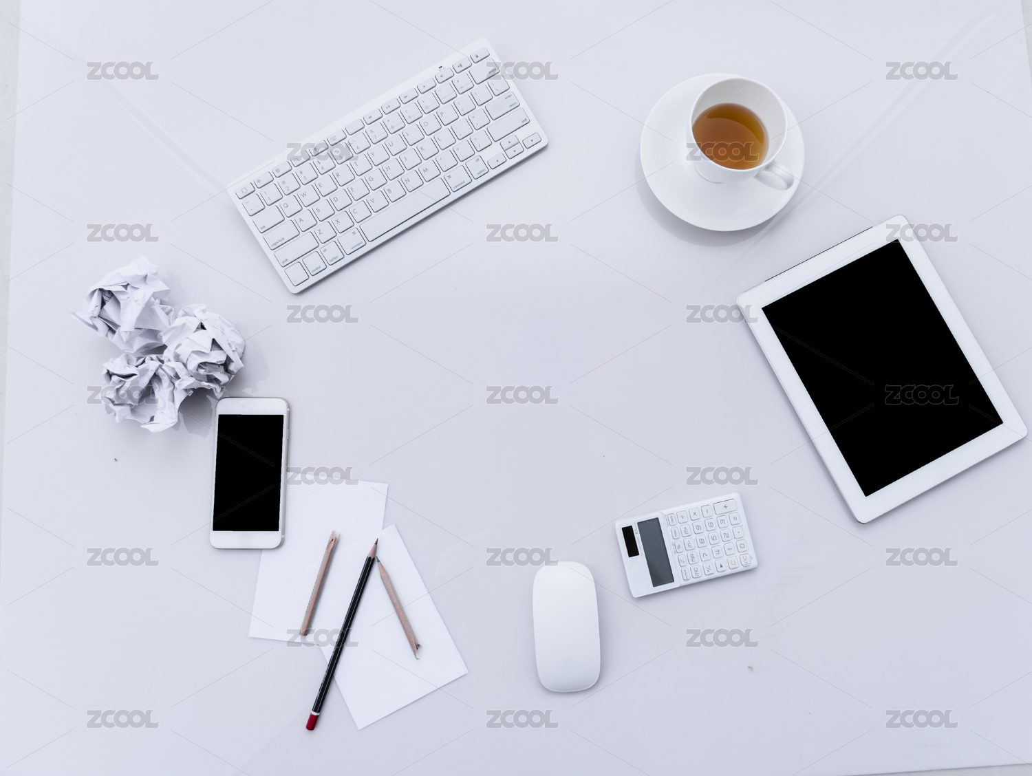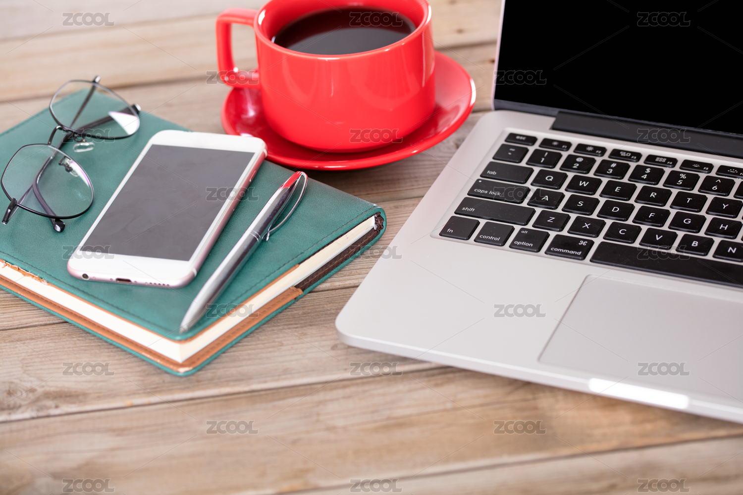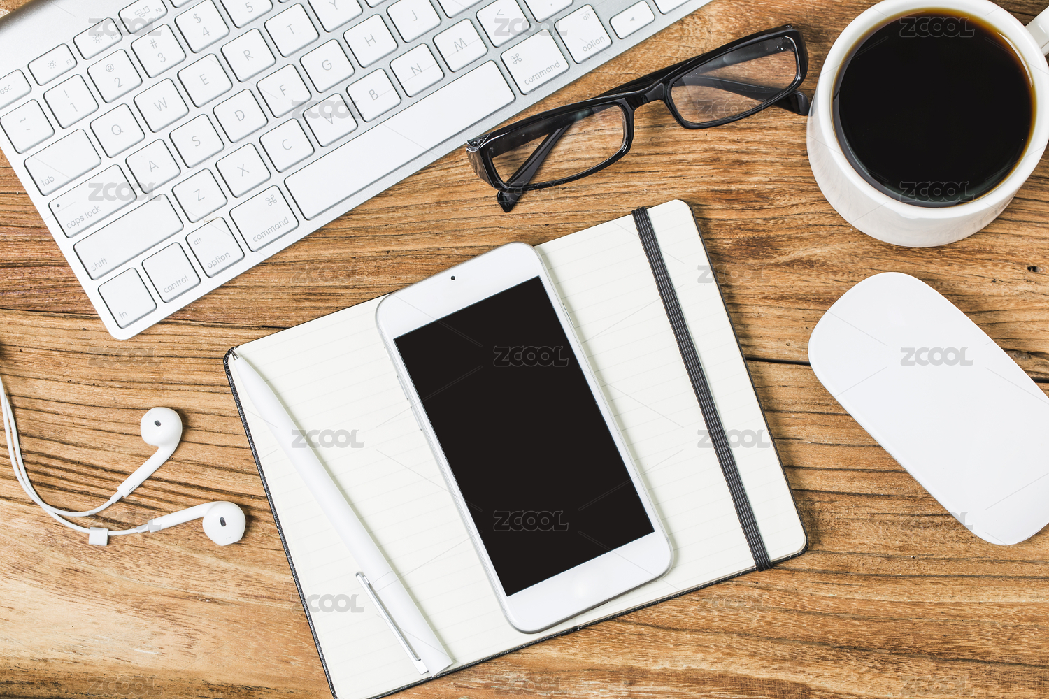 正上方视角特写书桌上放着笔记本电脑,眼镜,智能手机和咖啡