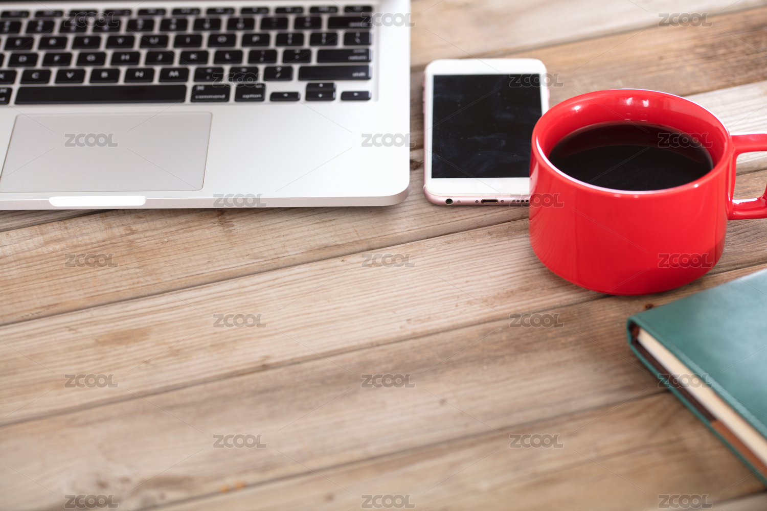 笔记本电脑手机和平板笔记本和咖啡的桌子上的杯子