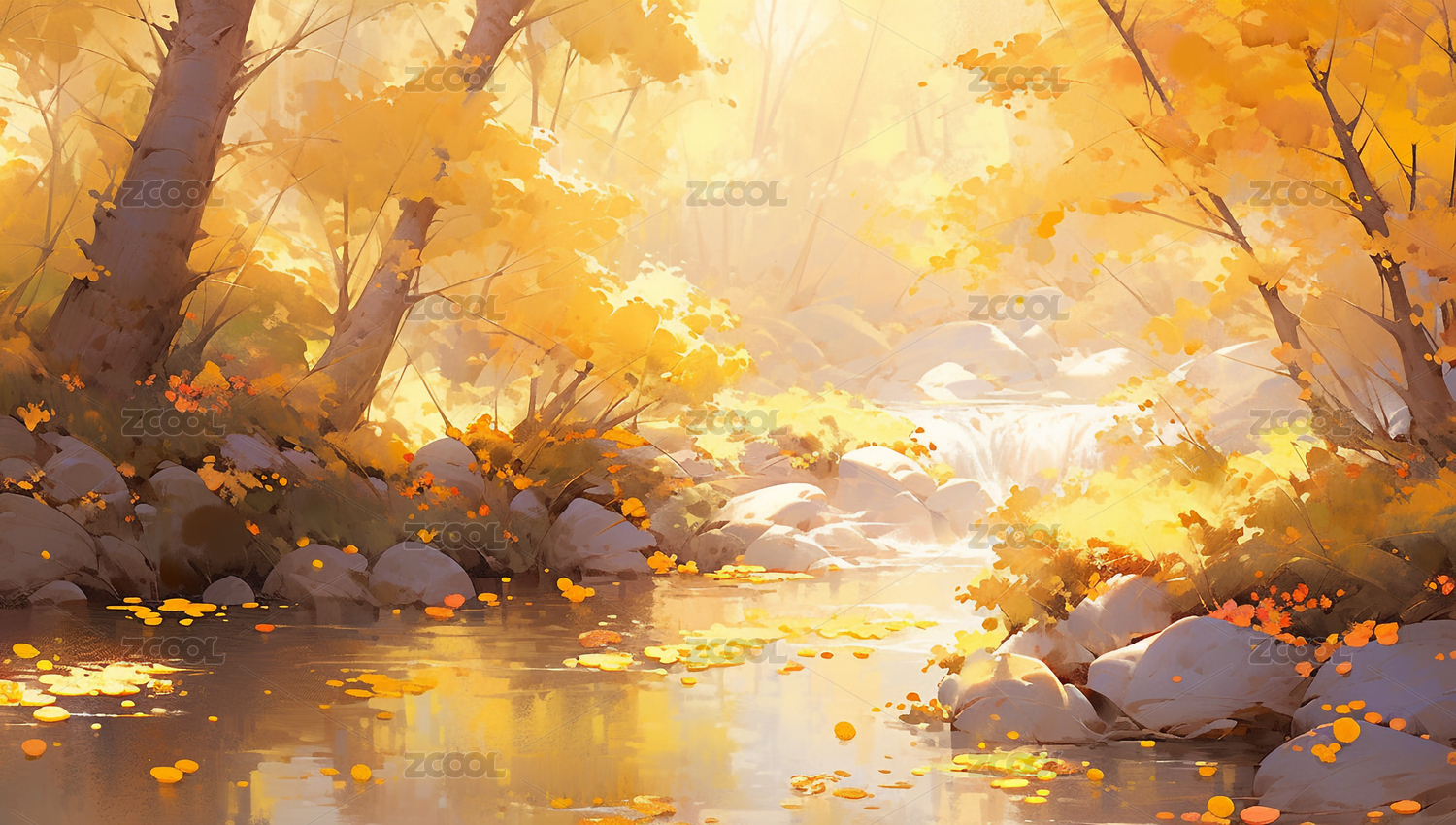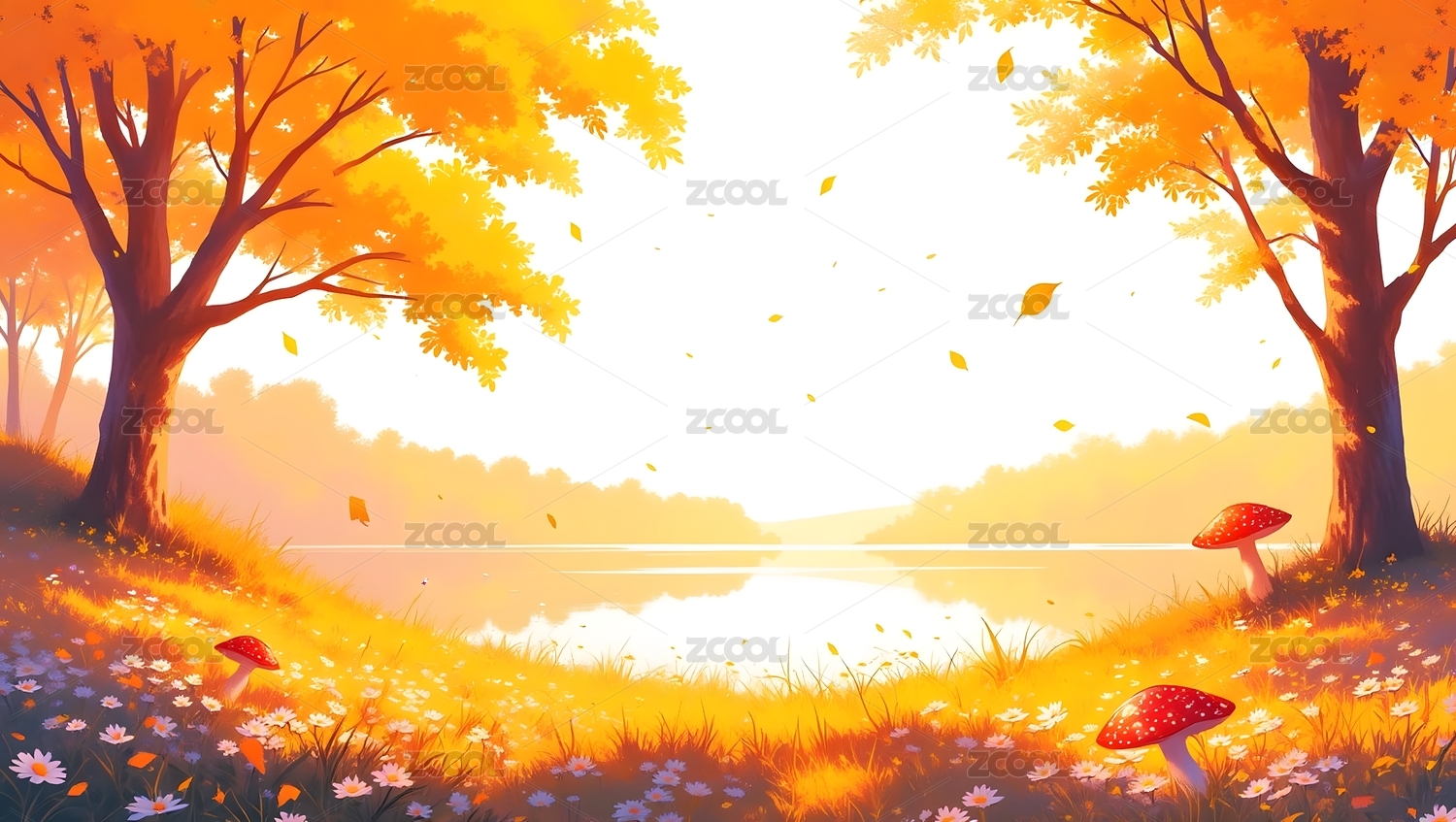 自然,插画,风景,树,天空,宁静,河流,枫树,枫叶,红色
