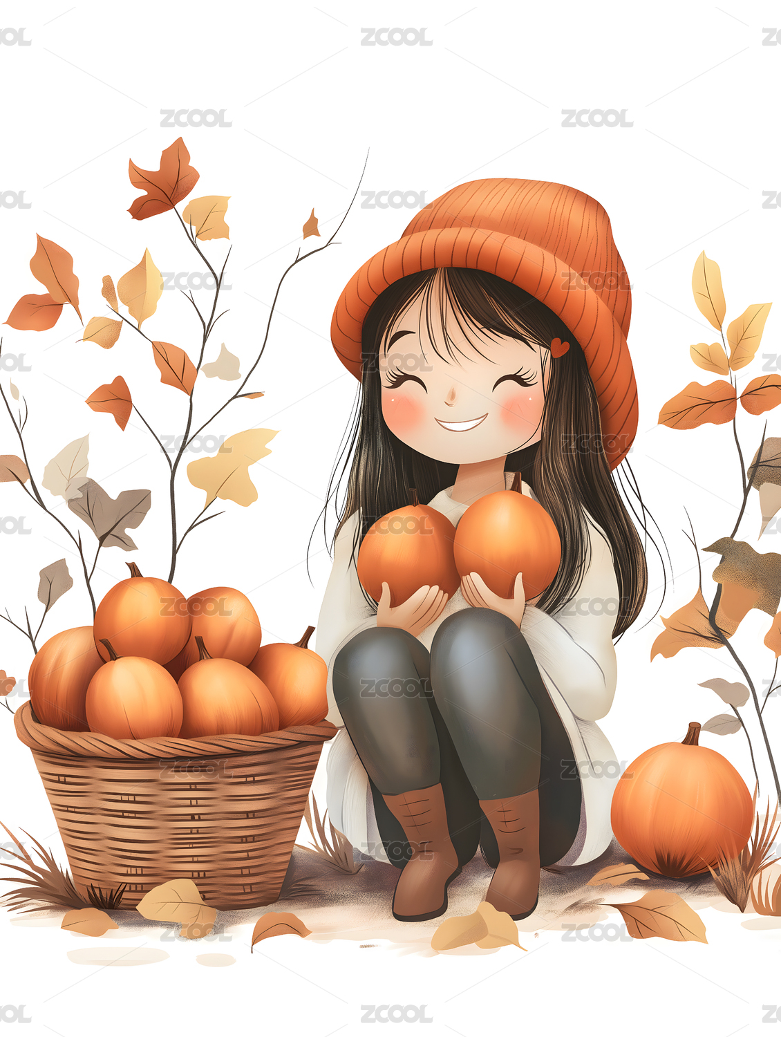 女孩,秋天,立秋,奔跑,光脚,南瓜,秋分,开心,娃娃,插图