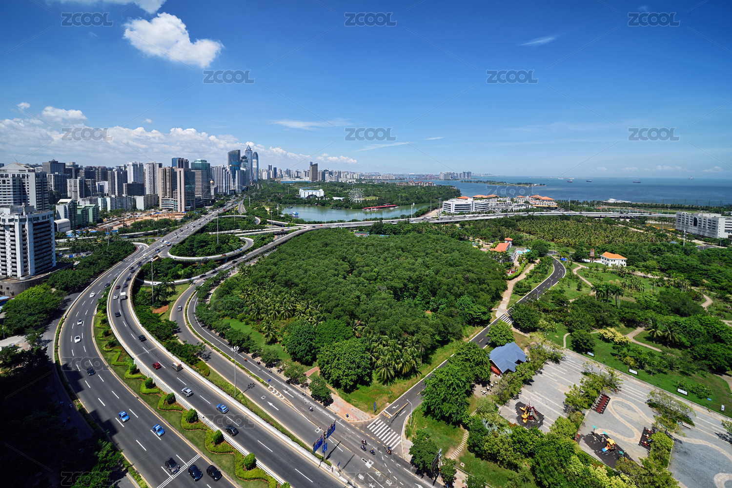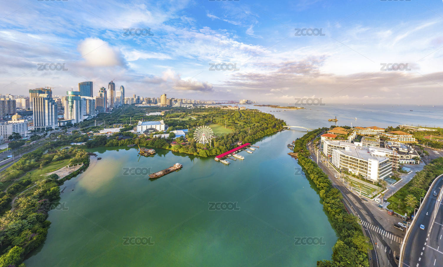 Aerial View of Buildings and Parks in Binhai Central Business District and Parks of Haikou City in Hainan Island of China