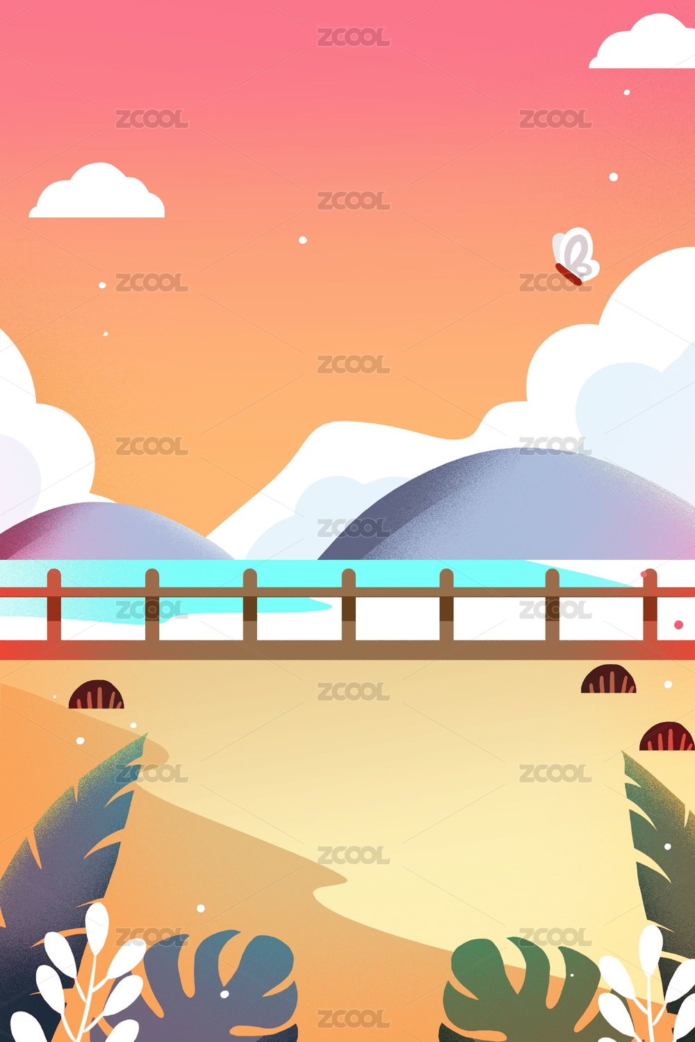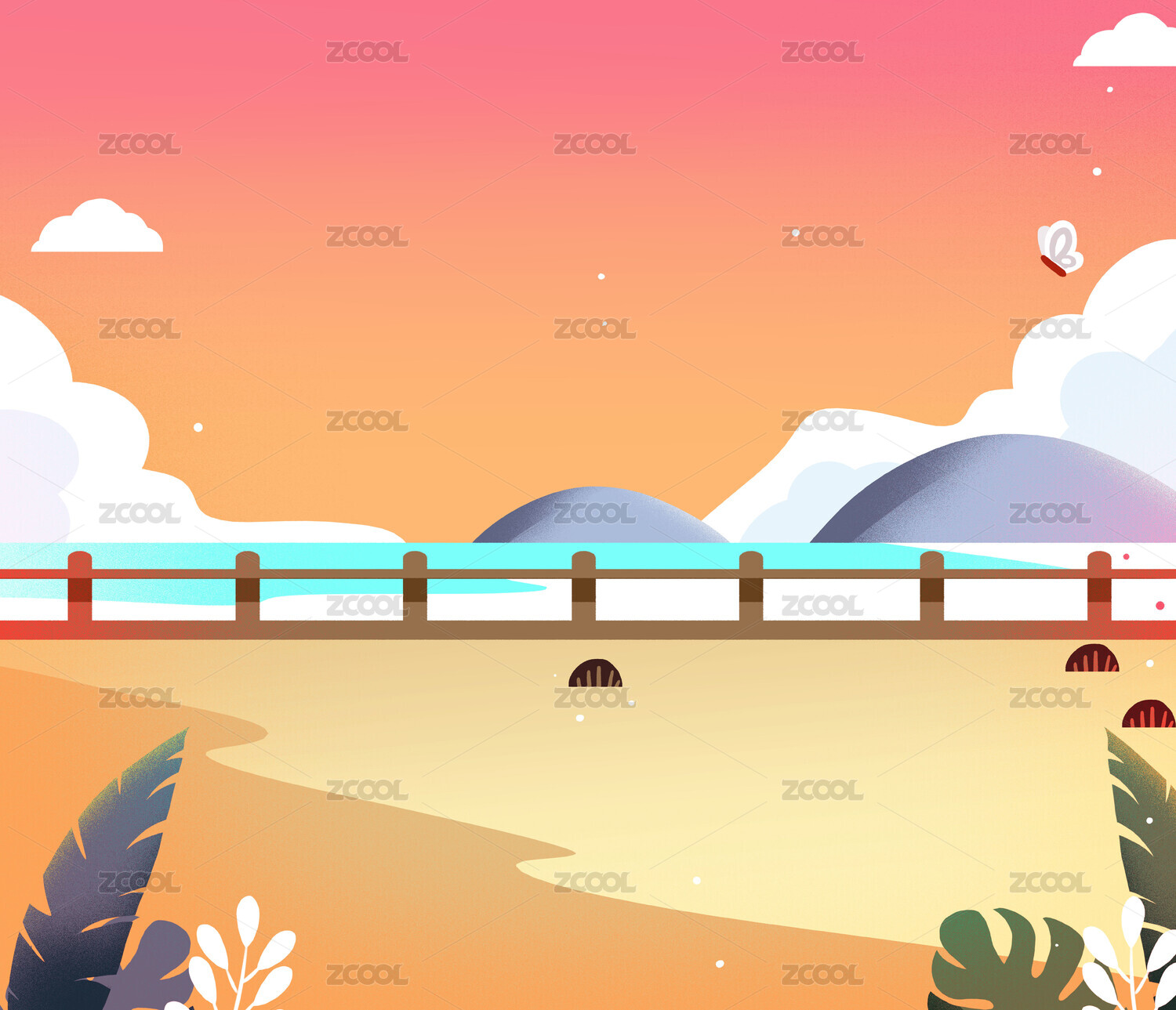 卡通手绘渐变浪漫晚霞清晨海边插画