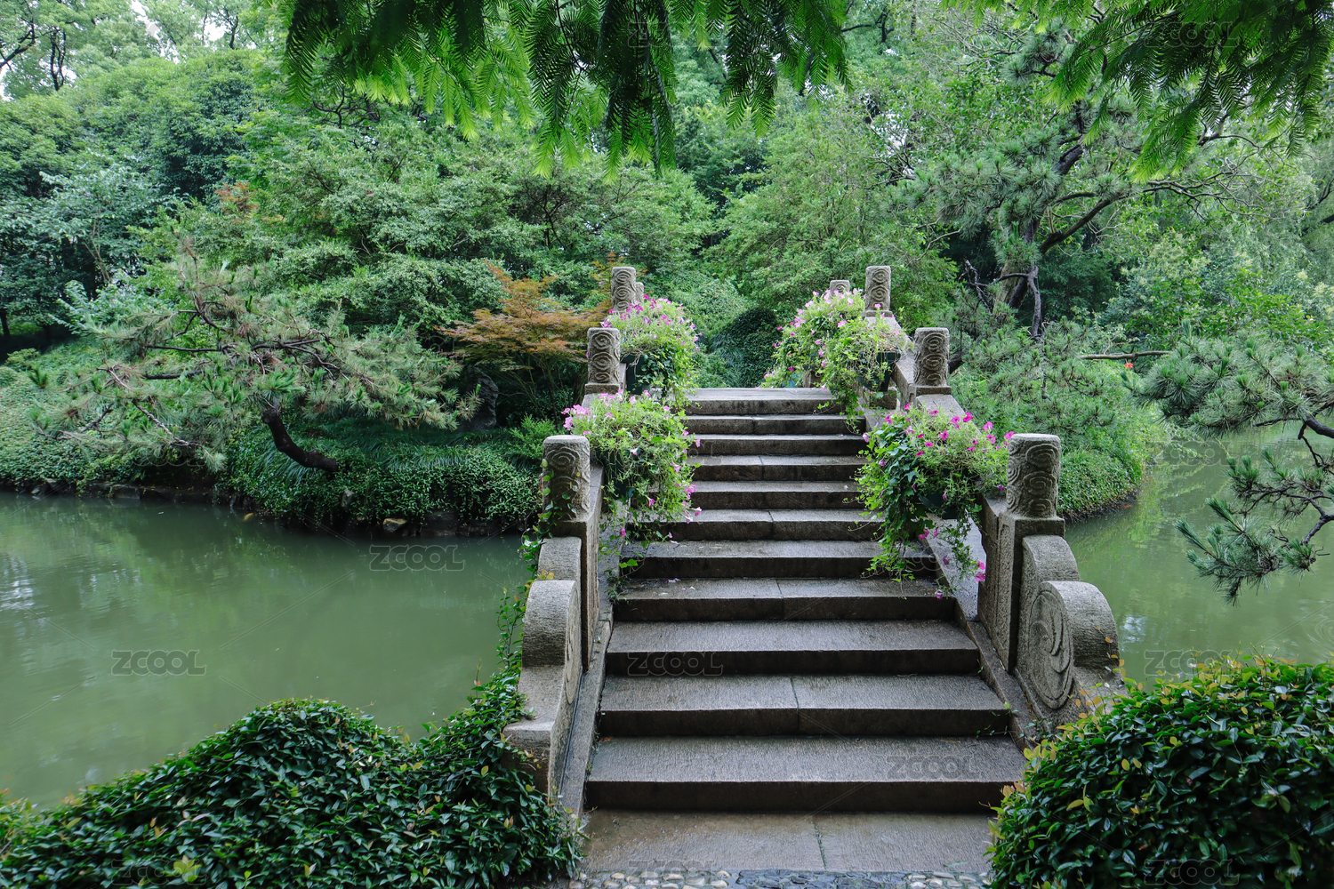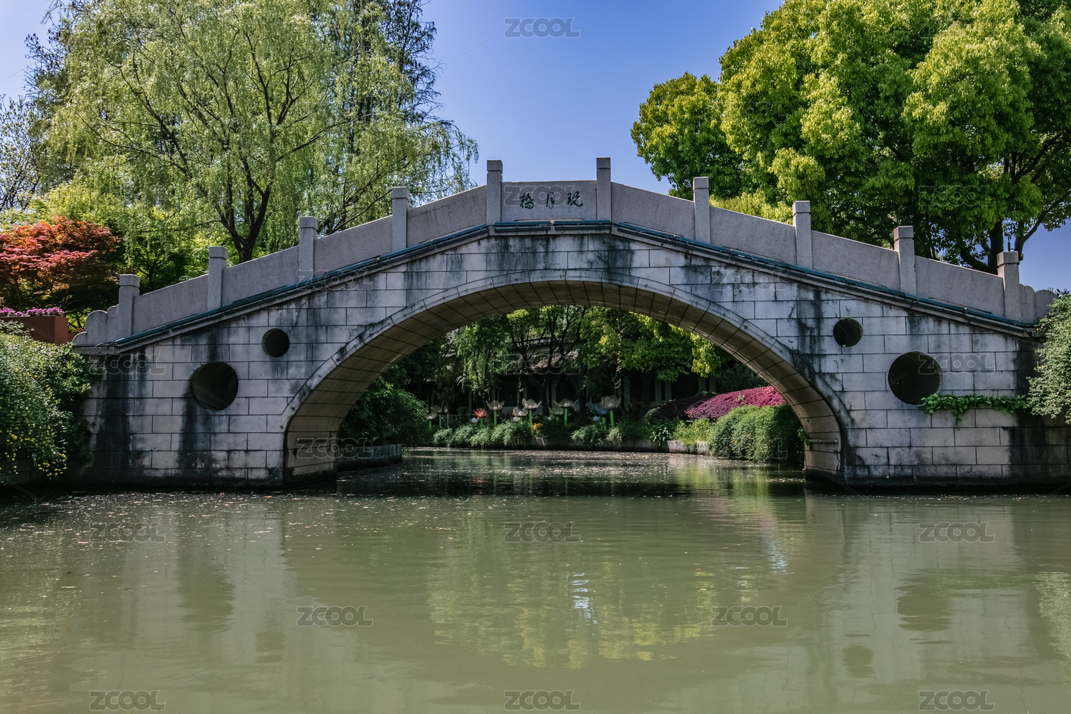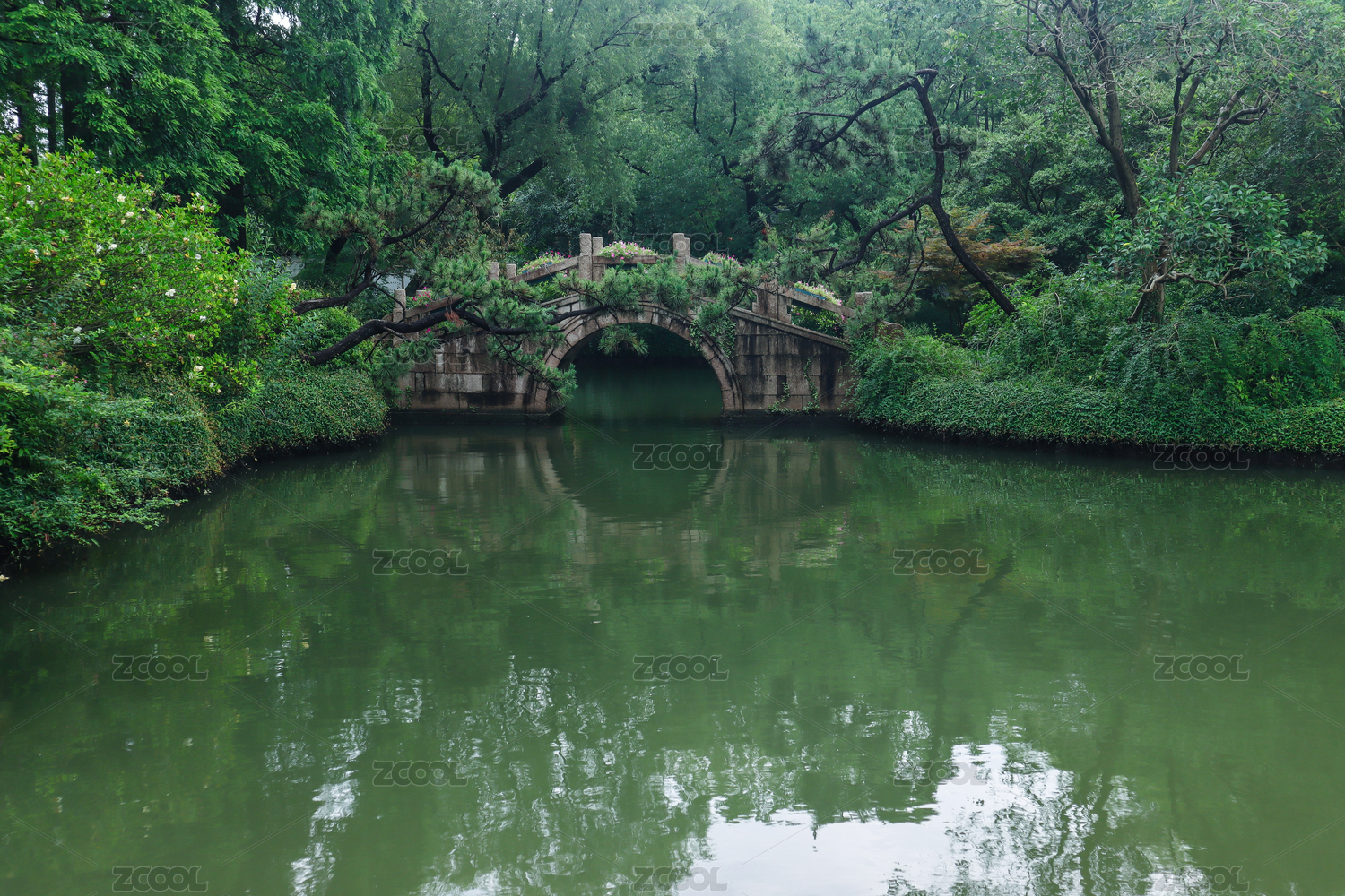 浙江杭州西湖畔绿意盎然的古桥倒影