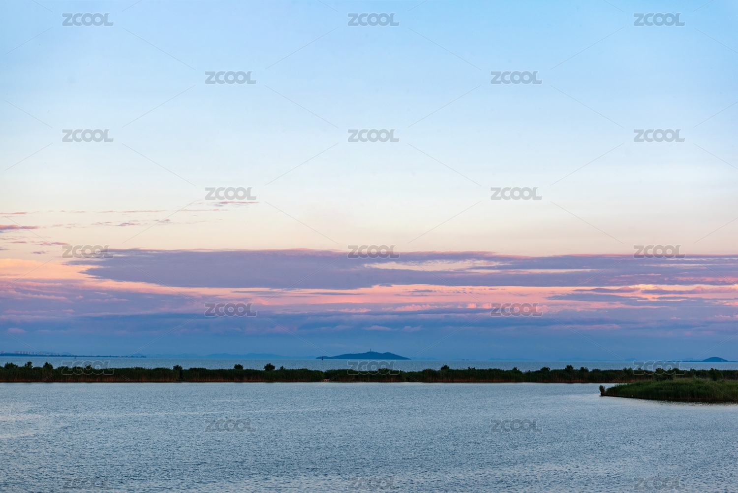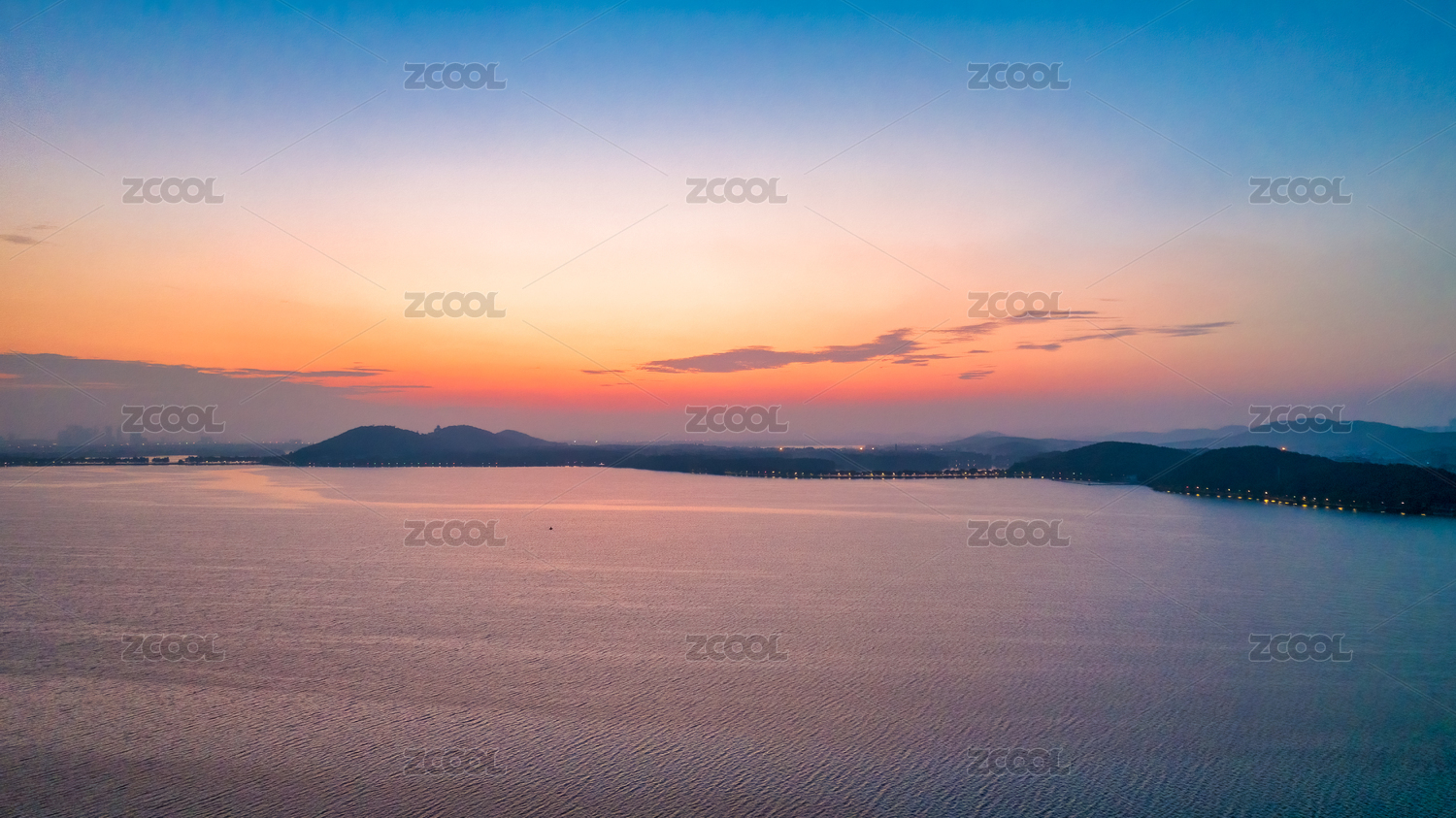 中国安徽合肥巢湖岸边远眺姥山岛,天空有少量火烧云