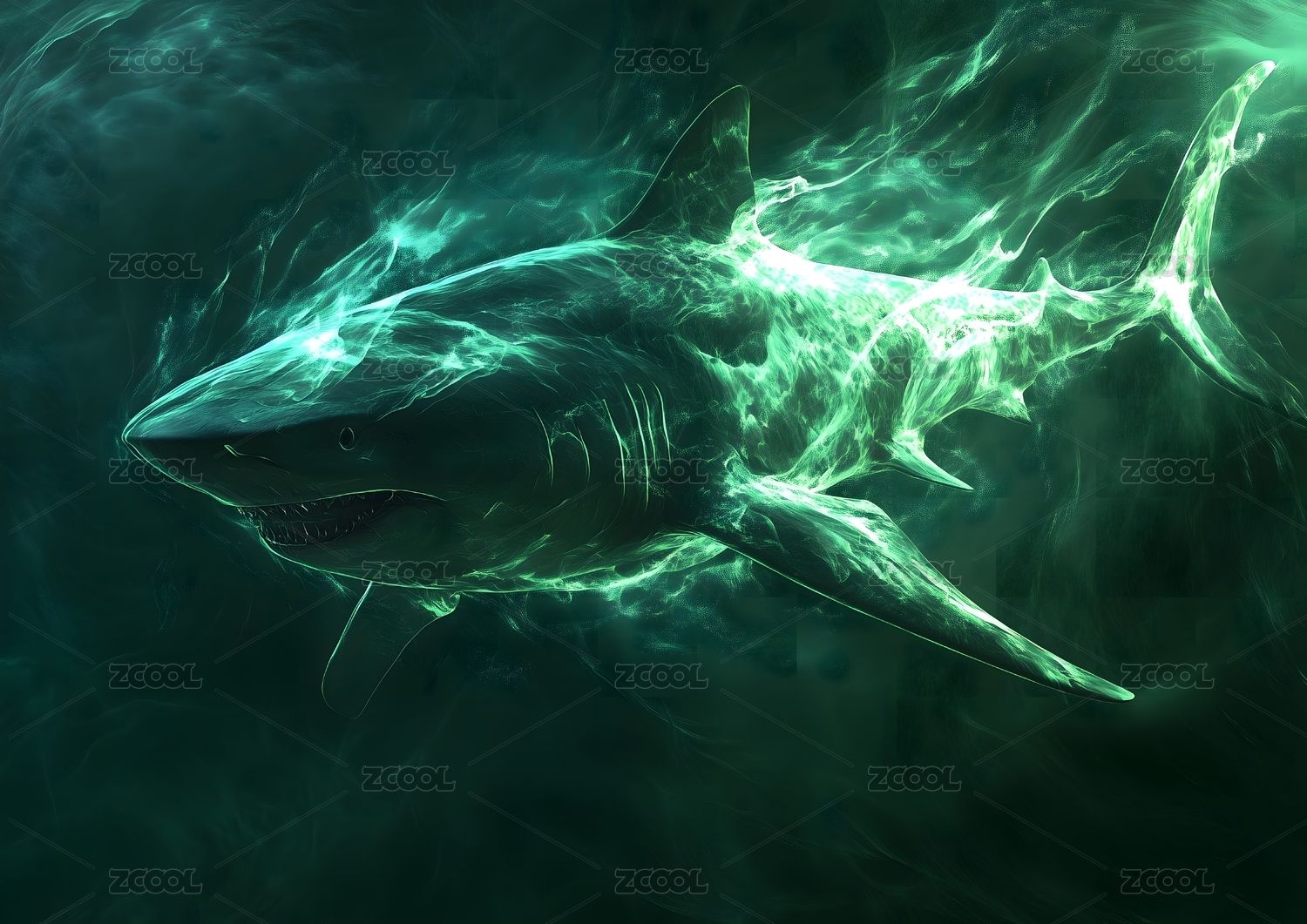 电脑数字成像绿色荧光的鲨鱼特写图片