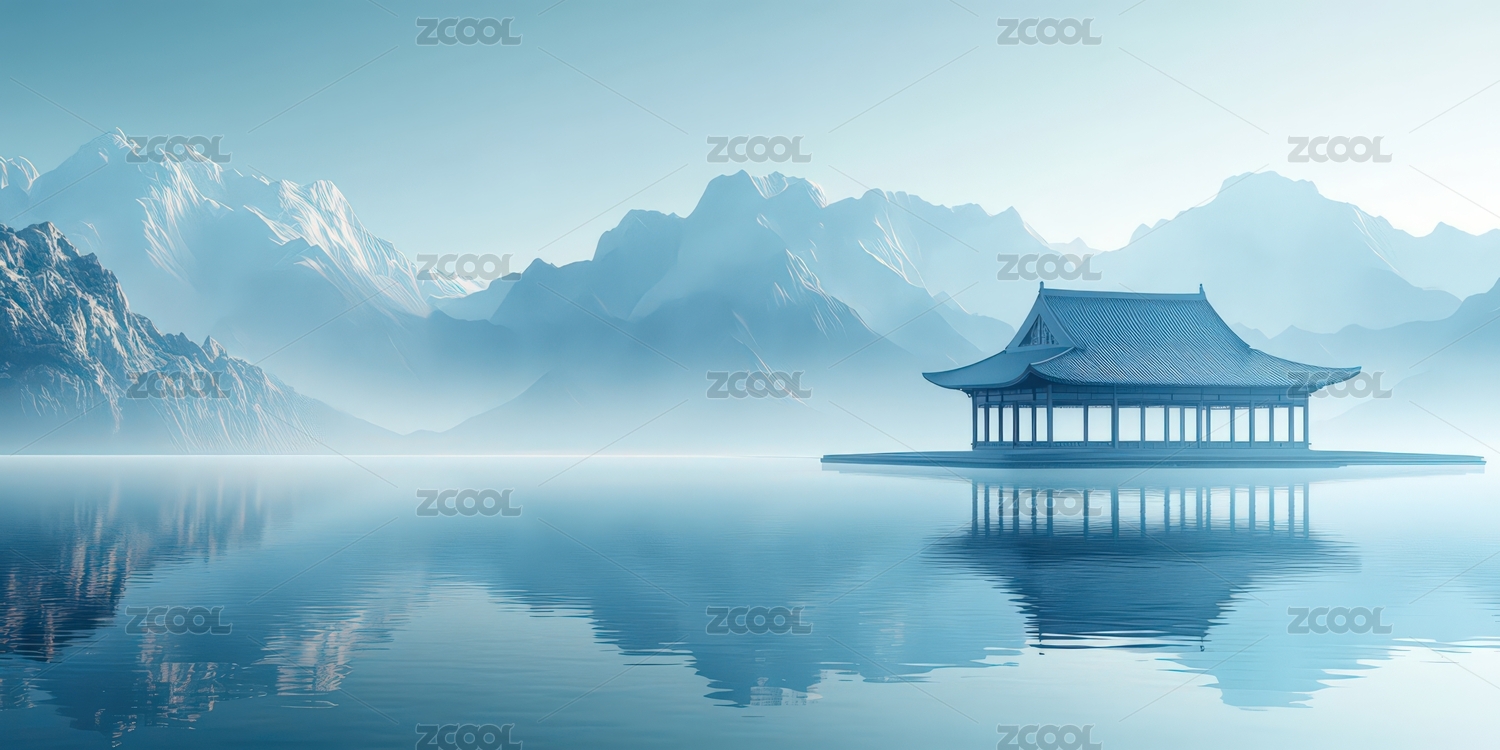 蓝色水面上的亭子古建筑风景