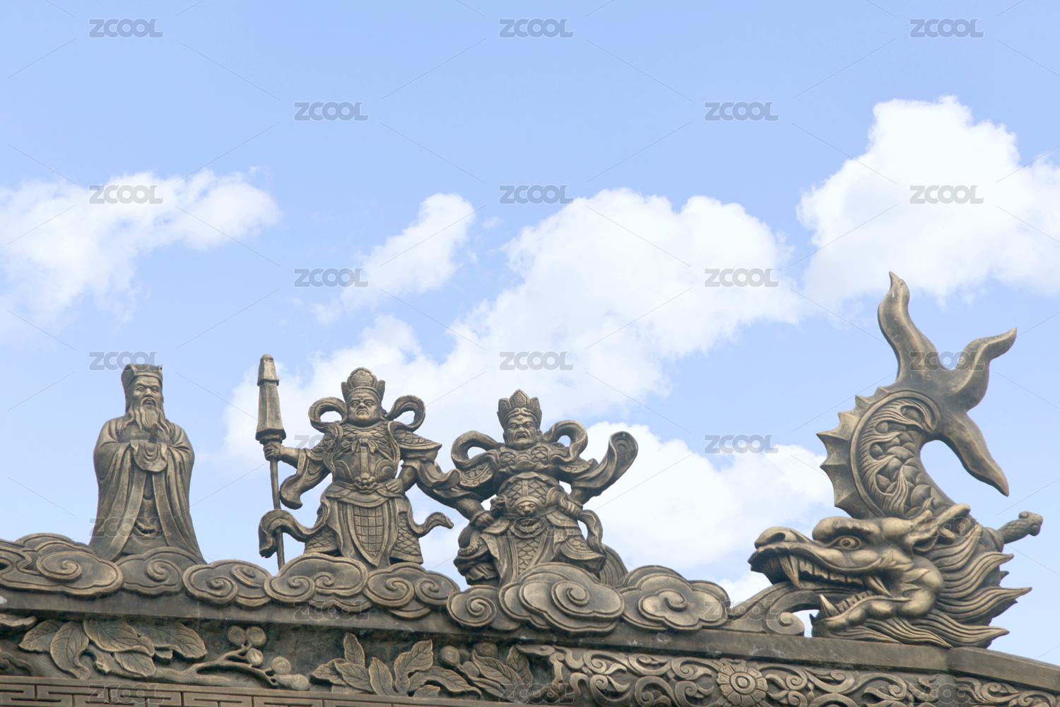中国四川成都大慈寺山门正脊天王和吞兽脊饰雕塑