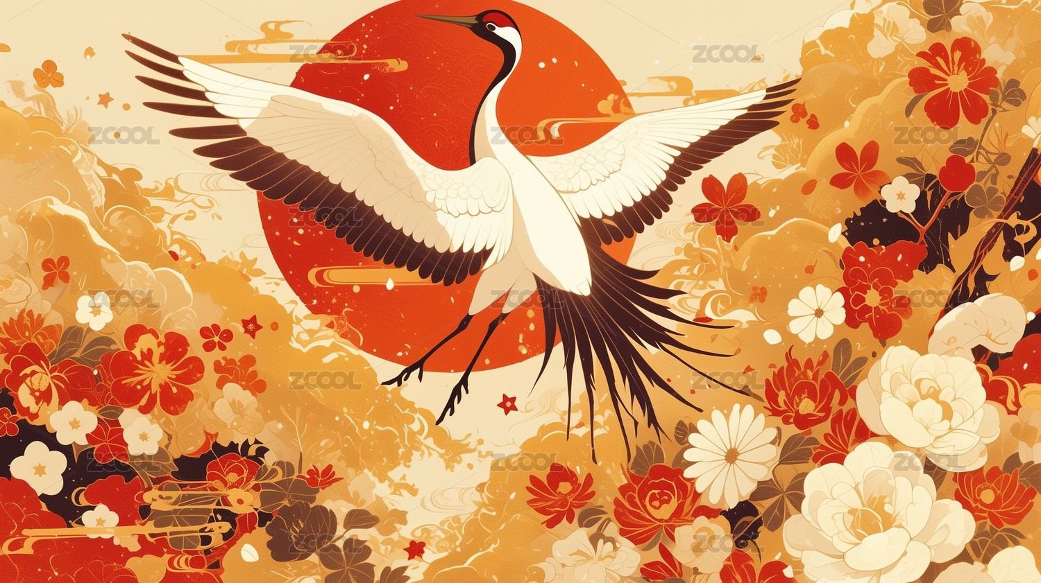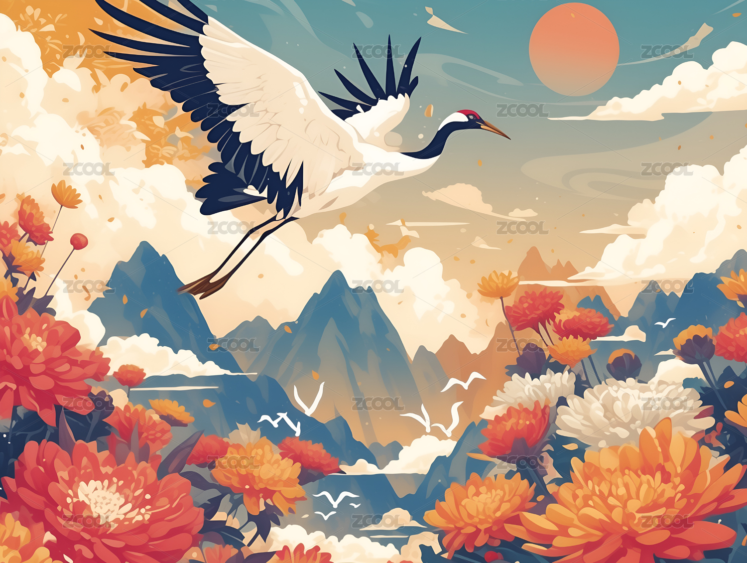 AIGC202406,重阳节,菊花,仙鹤,浮雕,登高节,中国风,剪纸风,插画,风景