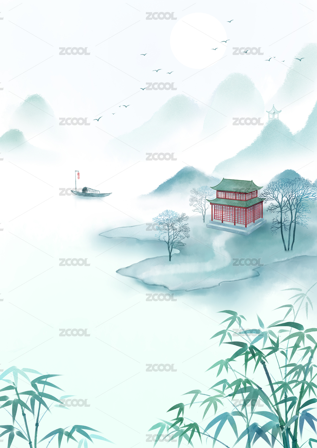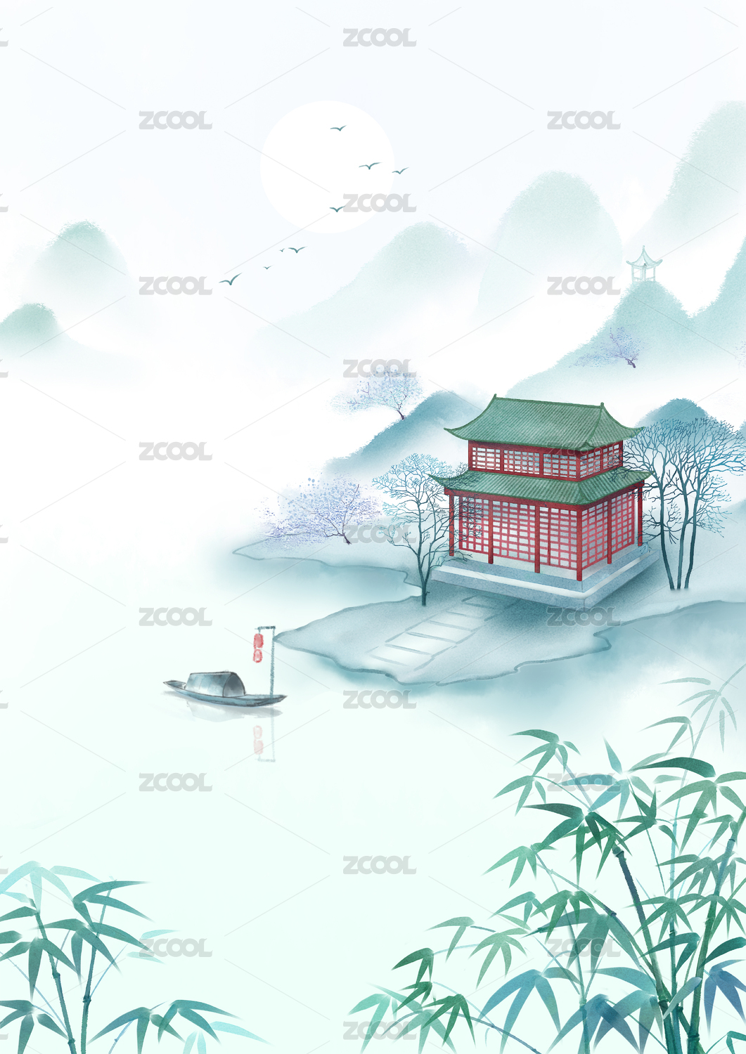 手绘国风意境水墨山水插画