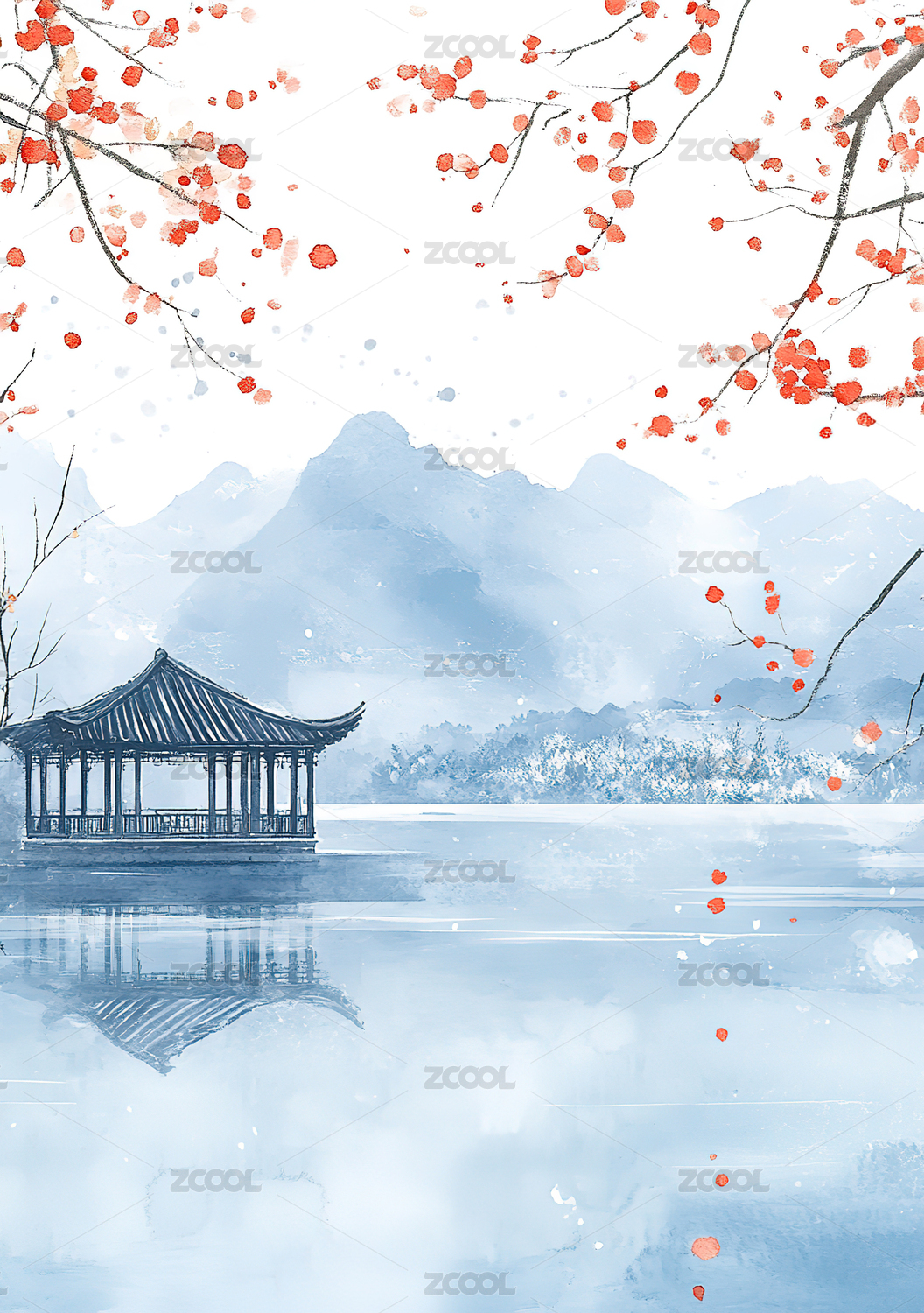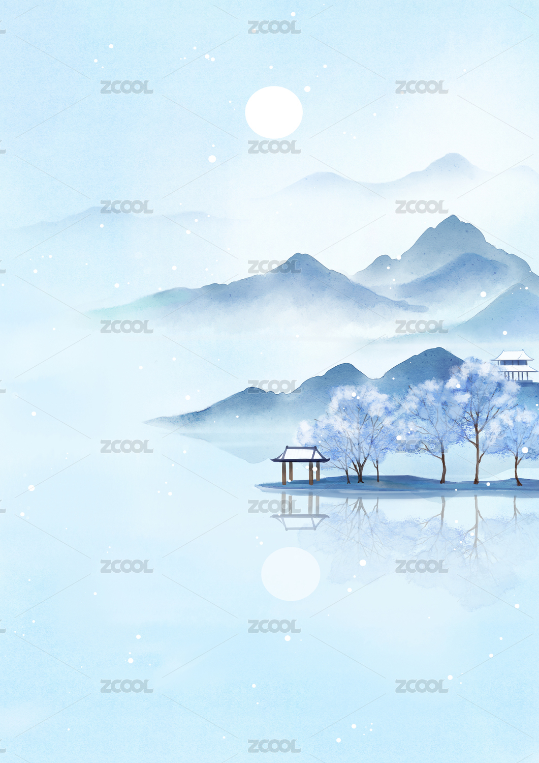 手绘立冬节气山水风景插画