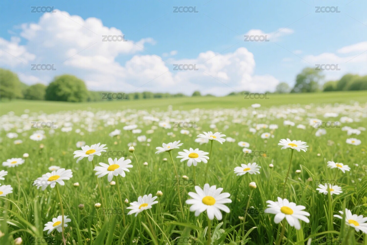 蓝天白云下的雏菊花田