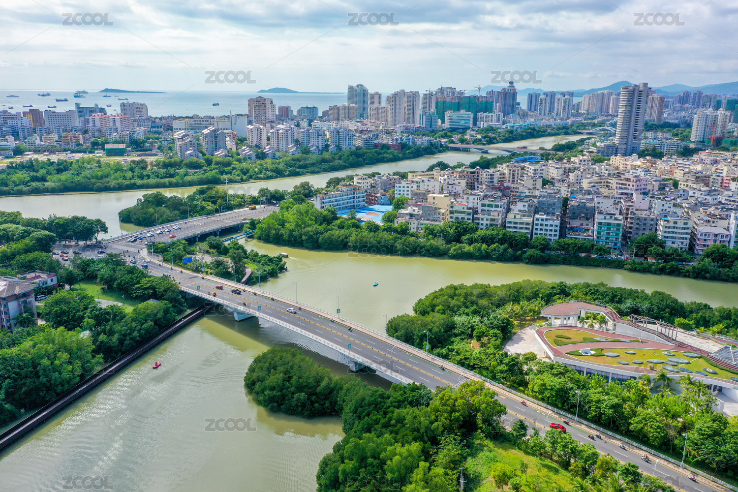 航拍中国海南三亚河临春河交汇处丰兴隆榕根桥段