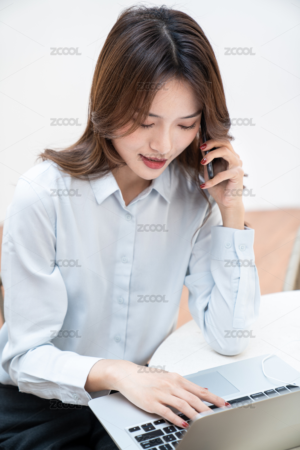 一位一边打电话一边用手提电脑移动办公的中国年轻女白领