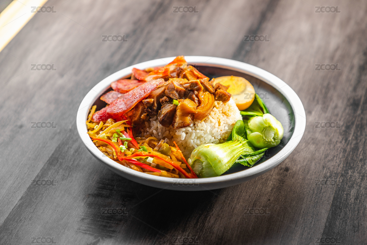 棕色木纹桌面上放着一碗砂锅腊肠炖肘子盖饭