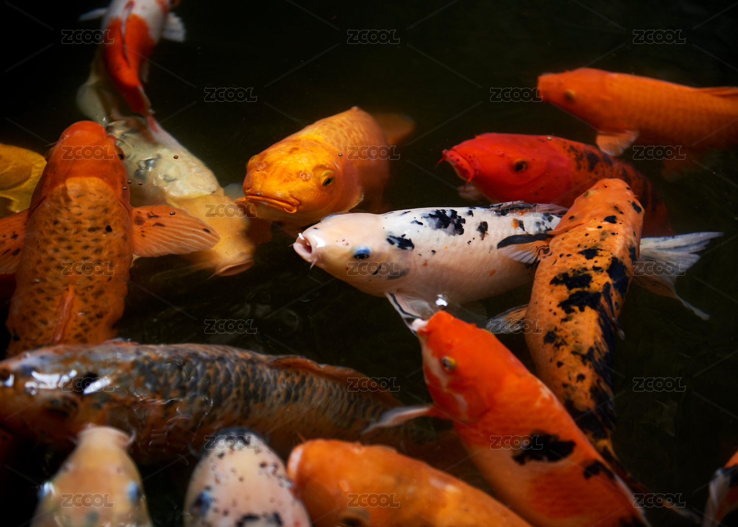 许多鲜艳红色的锦鲤鲤鱼在水池里游动