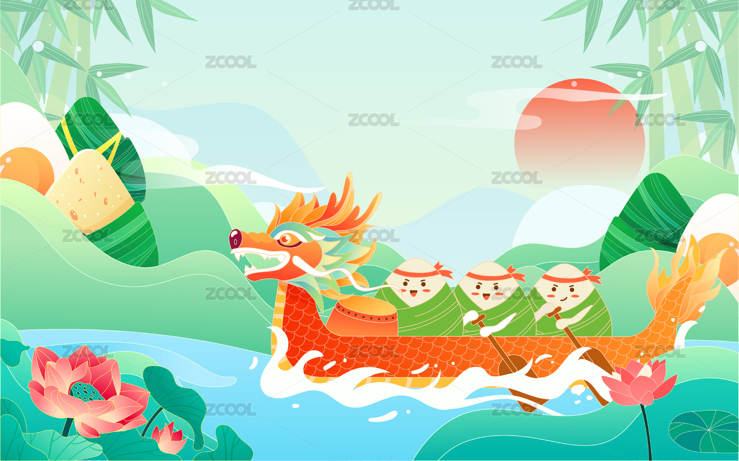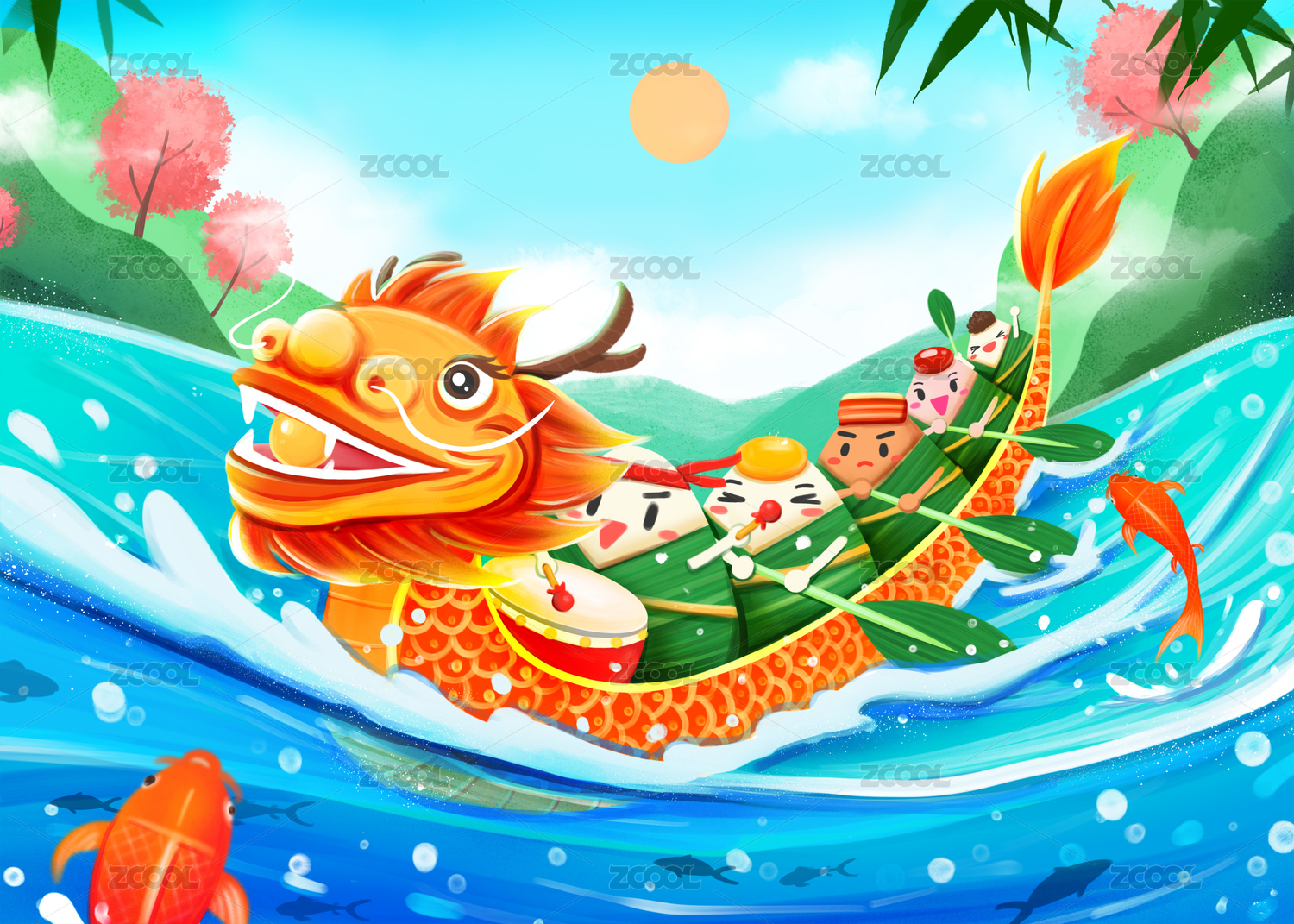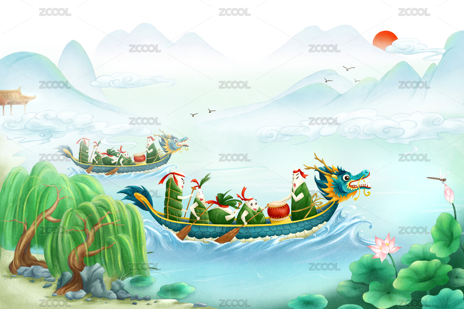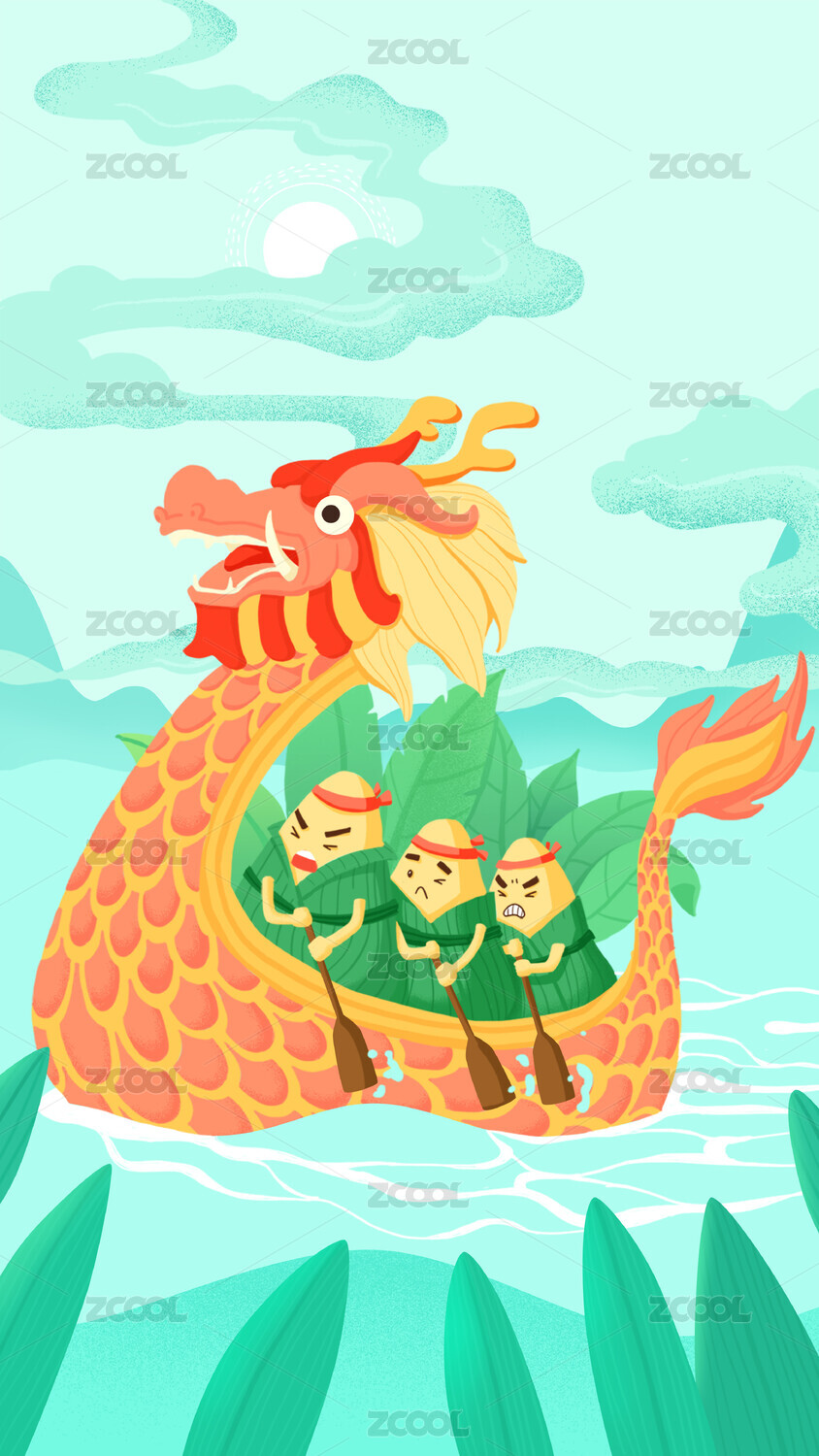 端午节赛龙舟传统节日活动粽子美食国潮插画