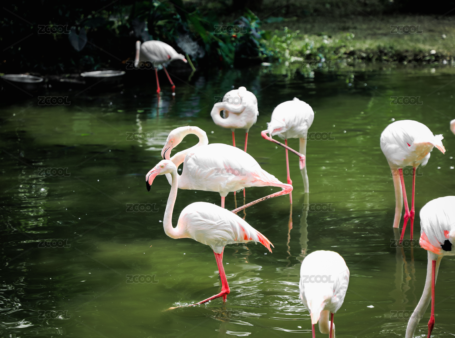 公园水池里的一群火烈鸟
