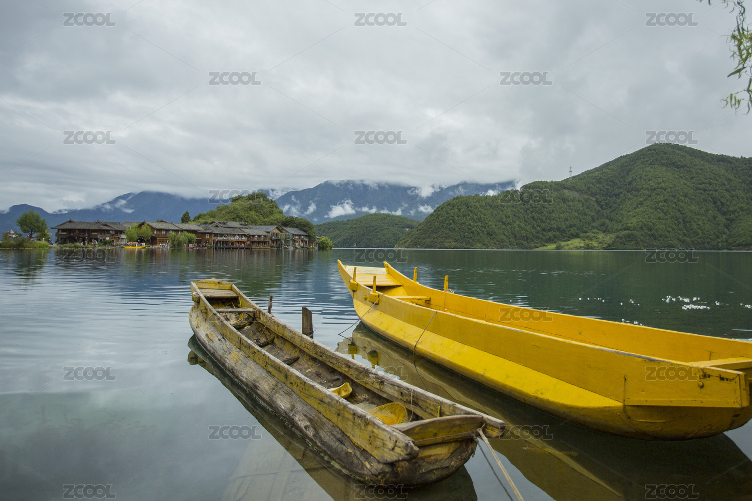 中国,云南,泸沽湖,傍晚,湖边,湖面,木船,蓝天,倒影,灯光