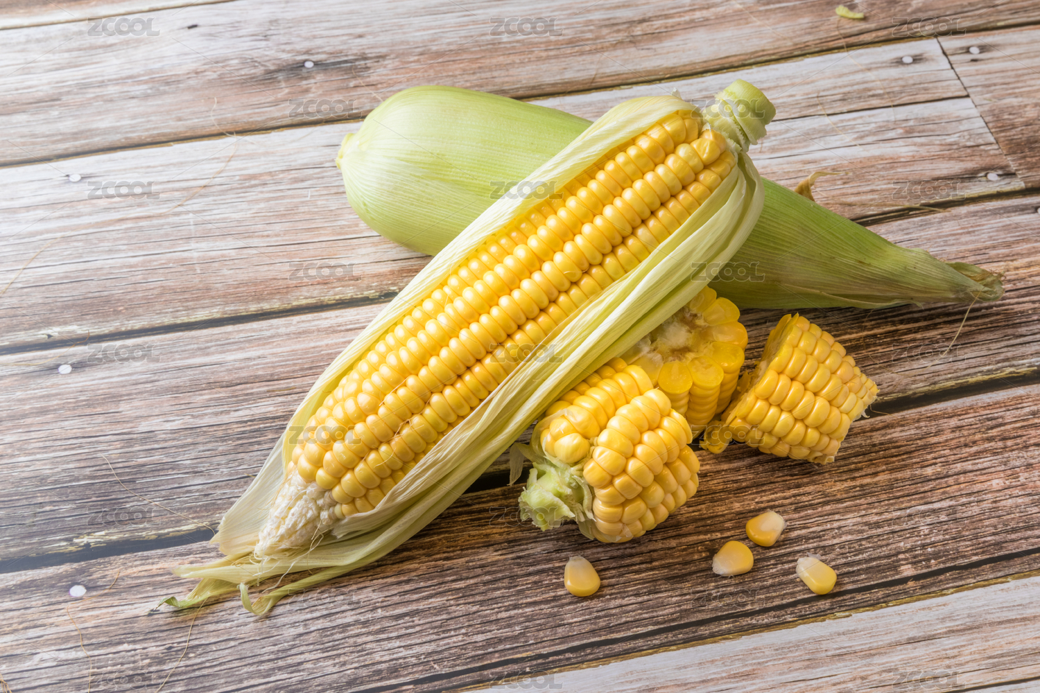 在质朴的木制餐桌上的鲜玉米特写、创意