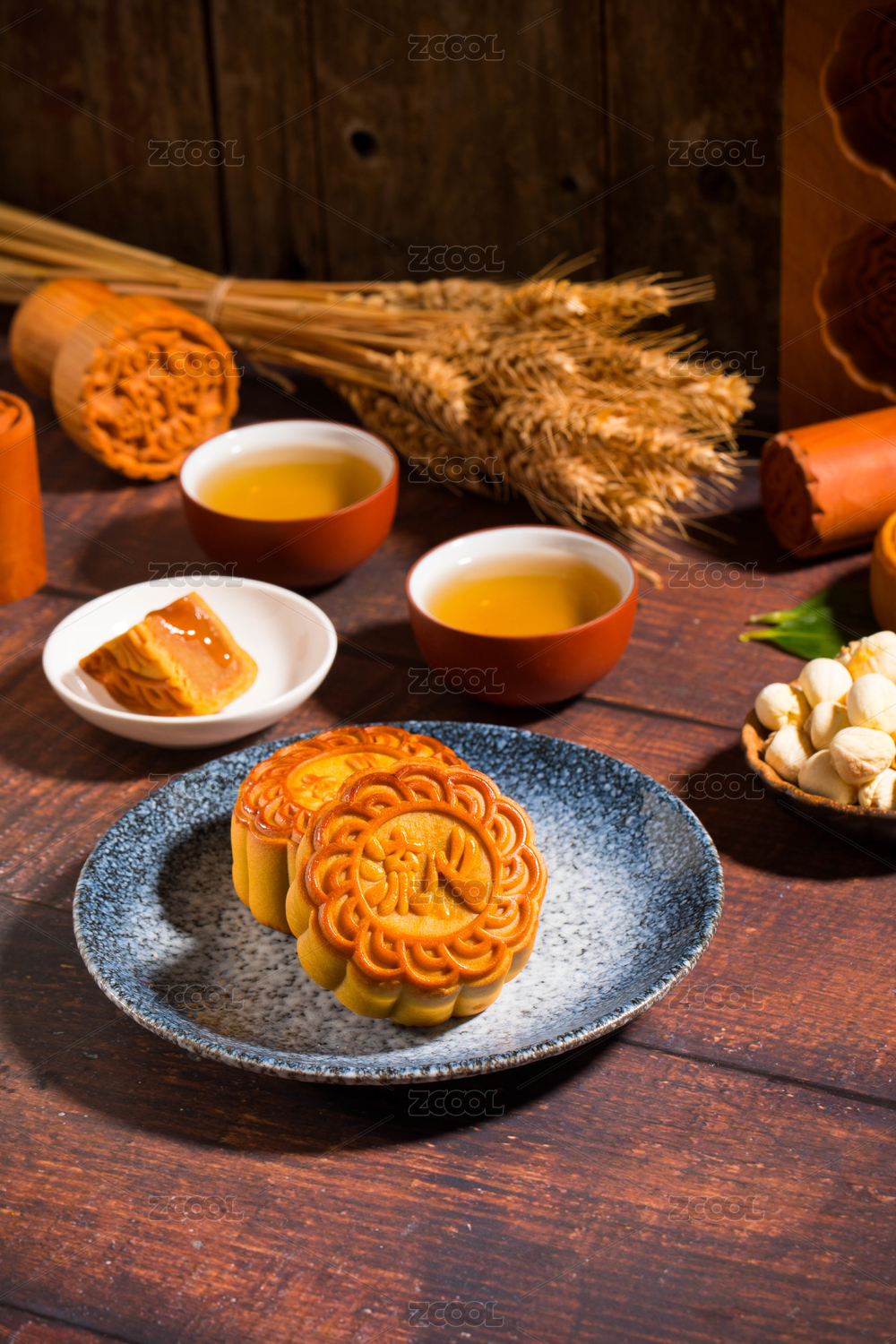两个放在蓝色盘子里流心月饼,周围放着茶杯和麦穗