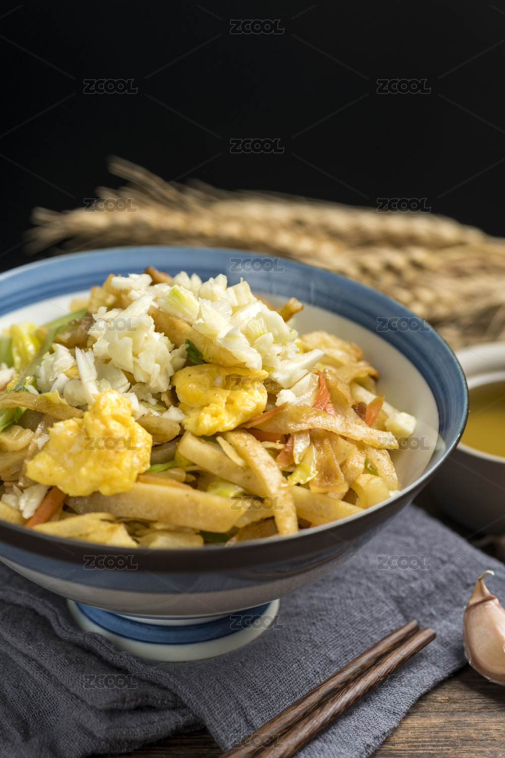 一碗鸡蛋炒饼摆放在木桌面上特写